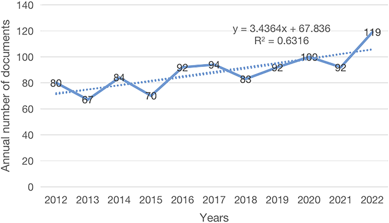 Between 2012 and 2022, a total of 974 articles were published, including 734 articles and 240 reviews. The number of papers published each year can indicate trends in a specific field of study. The analysis results show that the number of related papers published each year is large and growing slowly, with a peak in 2022 (n = 119) (Figure 2). It demonstrates that researchers are paying increasing attention to the field of visceral hypersensitivity. Furthermore, the growth trend model [Coefficient of determination (R2) = 0.6316] reveals a significant relationship between publication year and quantity (Figure 2). The model also forecasts there will be 109 related publications by 2023.