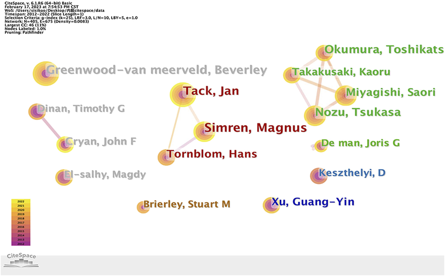 There are a total of 405 authors who contributed to the publications in regard to IBS and visceral hypersensitivity. In accordance with Figure 5, 405 nodes and 675 links are shown on the authors’ network map. Table 1 lists the top 5 authors who published the most articles. Simren, Magnus made the greatest contribution to the number of articles (17 publications, 22.67%), with a centrality of 0.1, followed by Greenwood-van meerveld, Beverley (16 publications, 21.33%), Tack, Jan (15 publications, 20.00%), Nozu, Tsukasa (14 publications 18.67%), Okumura and Toshikatsu (13 publications, 17.33%). Simren, Magnus, Greenwood-van meerveld, Beverley, Tack, Jan, Nozu, Tsukasa, Okumura, and Toshikatsu have made important achievements and great influence in the research field of IBS and visceral hypersensitivity.