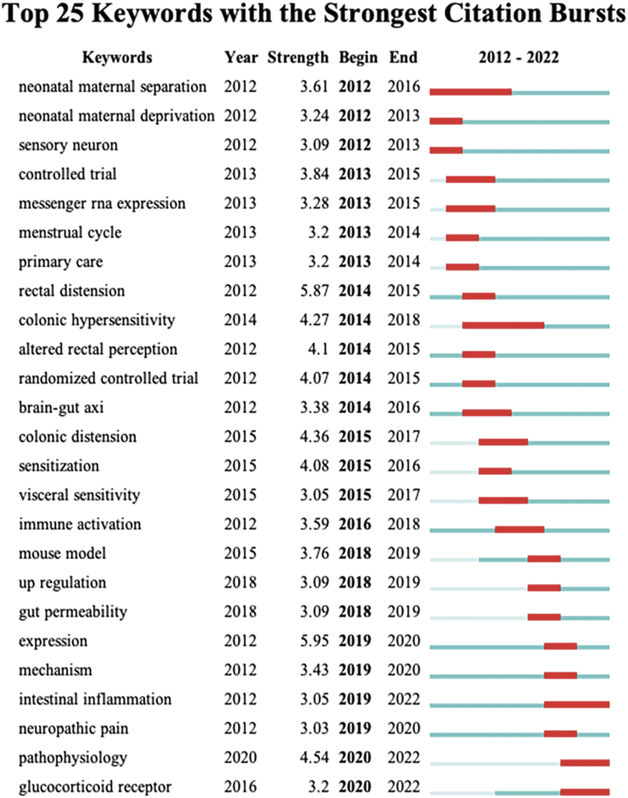 The research theme and scope of this field of study can be immediately understood through the keyword co-occurrence. The top 20 keywords in terms of frequency and centrality for IBS and visceral hypersensitivity from 2012 to 2022 are displayed in Table 4. What can we see from the table is that “irritable bowel syndrome” is the keyword with the highest statistical frequency, followed by “visceral hypersensitivity” and “mast cell”. What’s more, keywords such as “pain,” “abdominal pain,” “double-blind,” “activation,” “expression,” and “quality of life” were used more than 100 times, which reveals the current topic of research this field. Moreover, the gut microbiota requires attention in the first 20 keywords, outside of the pathogenesis keywords. Centrality represents the correlation between keywords. As shown in Table 4, the centrality of “colonic motility” ranks first, followed by “corticotropin-releasing factor,” “enteric nervous system,” “sensitivity” and “maternal separation.” Notably, these keywords combined IBS with visceral hypersensitivity and related other studies.
