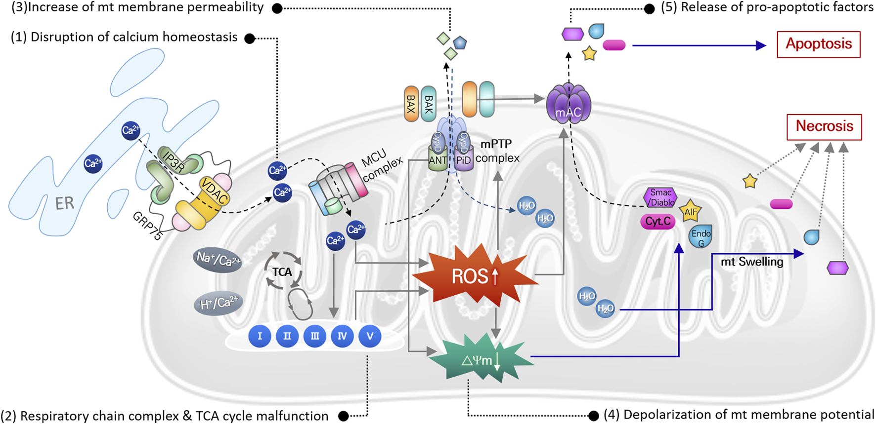 Mitochondrial ROS-induced damages causing mitochondrial dysfunction. Direct damages of mitochondrial DNA and antioxidant enzyme, or disruption of ion homeostasis 1), or malfunction of the mitochondrial respiration system 2), can cause increase in mitochondrial ROS. It subsequently leads to increase in mitochondrial membrane potential 3) with depolarization of membrane potential 4), causing osmotic swelling of mitochondria and release of pro-apoptotic factors 5). Finally, cell death signaling pathways are activated by these apoptotic factors.