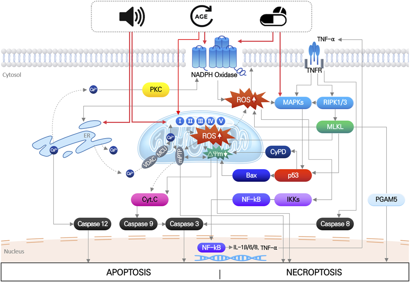 Noise, aging and ototoxic drug-induced intracellular signaling pathways leading to hair cell death. It indicates that organelle stress (ER and mitochondria), inflammation, MAPK signaling pathways induced by three environmental stimuli are all mutually interact each other, which finally leads to apoptosis or necroptosis of hair cells. Importantly, increase in mitochondrial ROS is at the center of all the pathways.