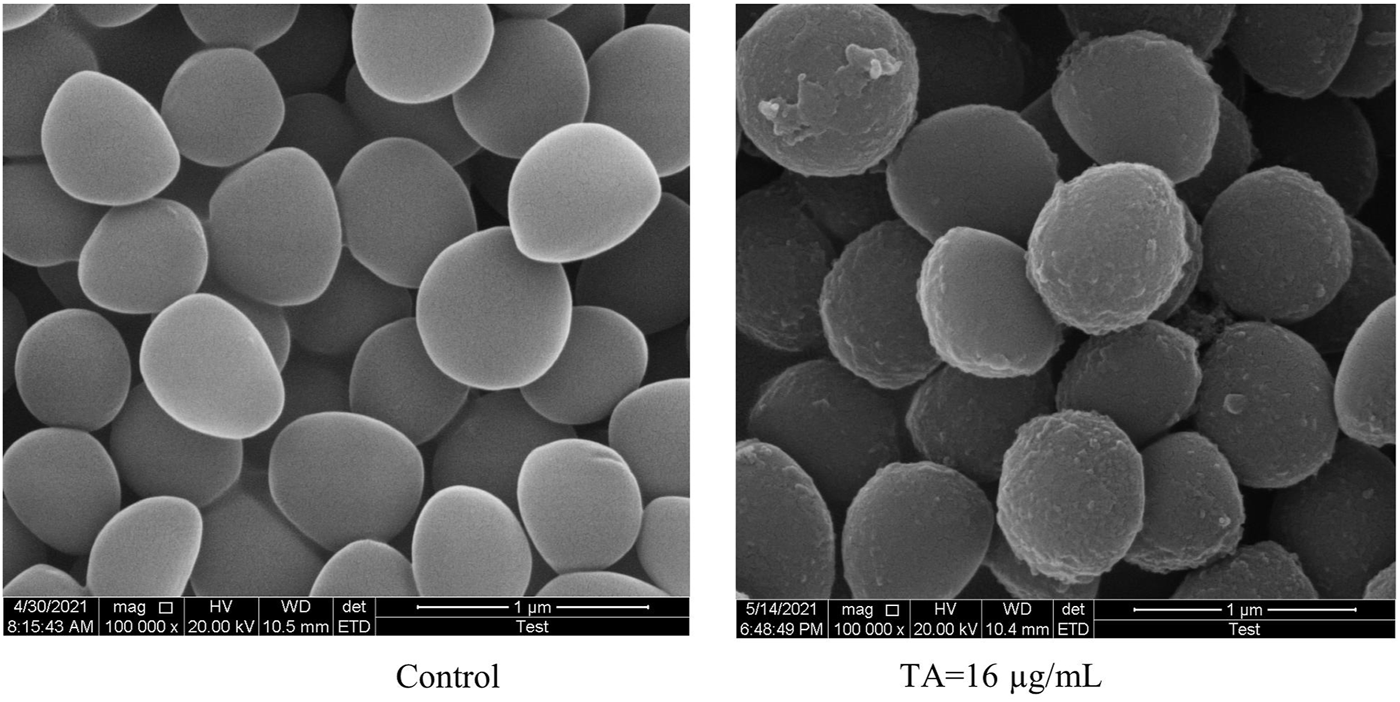 Scanning electron microscopy images showing the structure of S. aureus treated with 1/2 MIC TA for 6 h. Magnification: 1 000 000×.