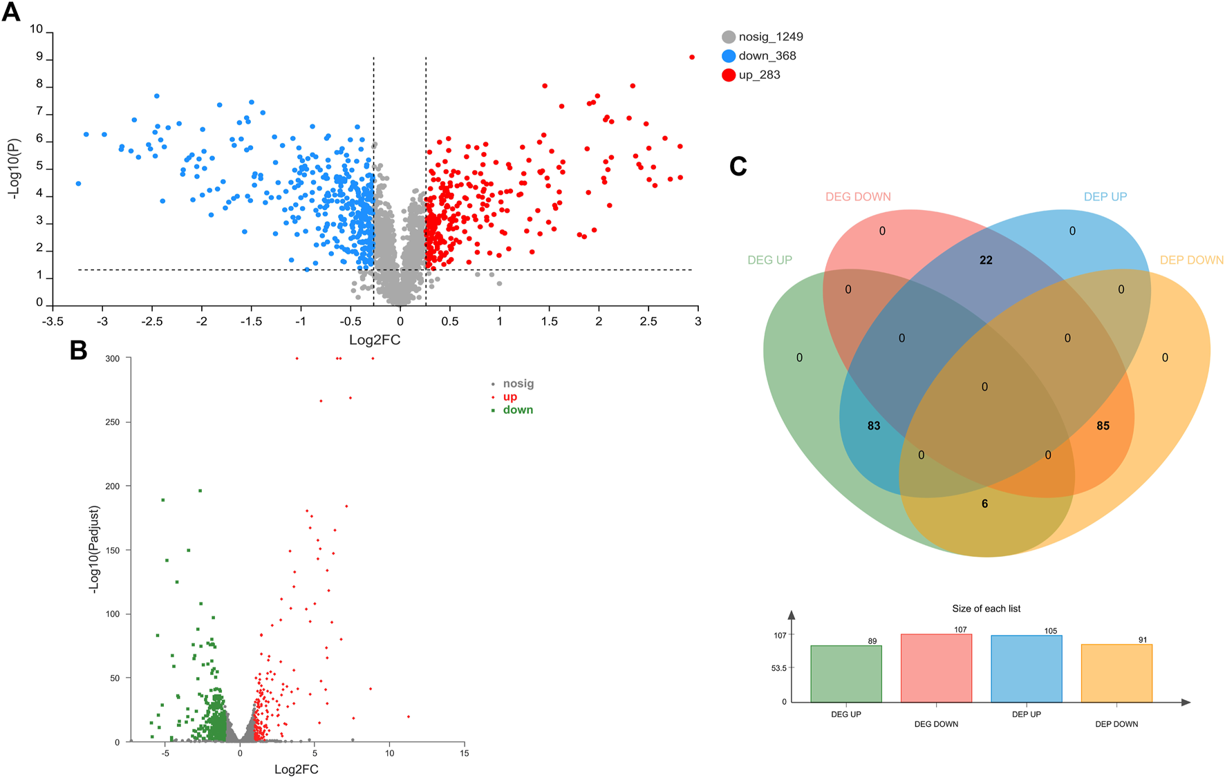 For transcriptome analysis, total RNA from each sample was extracted using Trizol reagent (Invitrogen, Carlsbad, CA) according to the instructions from the manufacturer. The cDNA library was constructed using the Illumina TruSeq™ Stranded Total RNA Library Prep Kit after analysis to determine the quantity of total RNA. Transcriptomics sequencing was performed on an Illumina HiSeq platform. Data analyses were performed using DESeq2 software. Genes with P-adjust <0.05 and |log2 fold change| ≥ 1 were considered to be differentially expressed genes (DEGs).