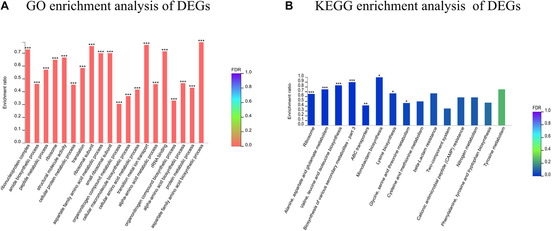 Functional classification of DEGs. (A) GO enrichment analysis of DEGs; (B) KEGG enrichment analysis of DEGs. *FDR<0.05, **FDR<0.01, ***FDR<0.001.
