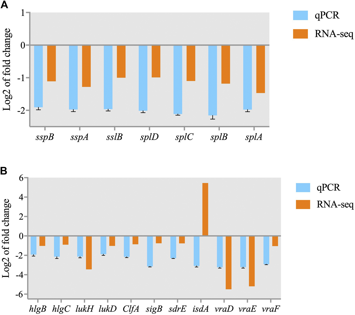 Quantitative real-time PCR (qRT-PCR) was conducted to confirm the differentially expressed proteins and genes from the proteome and transcriptome sequencing experiments. S. aureus ATCC 6538 was cultured under the same conditions used for the samples in the omics sequencing experiments. Total RNA was extracted from the TA and control groups using the TaKaRa MiniBEST Universal RNA Extraction Kit (TaKaRa, Dalian, China) according to the manufacturer’s protocol. 18 DEGs were selected for qRT-PCR analysis, and 16 S rRNA was used as the internal reference gene. qRT-PCR was performed by a two-step process using the PrimeScript™ RT Master Mix Kit and TB Green Premix Ex Taq TM II Kit (TaKaRa, Dalian, China). All genes were independently assayed three times. The relative quantitation of the mRNA expression level of each gene was calculated by the 2−∆∆ CT method. All of the primers and sequences are listed in Supplementary Table S1.