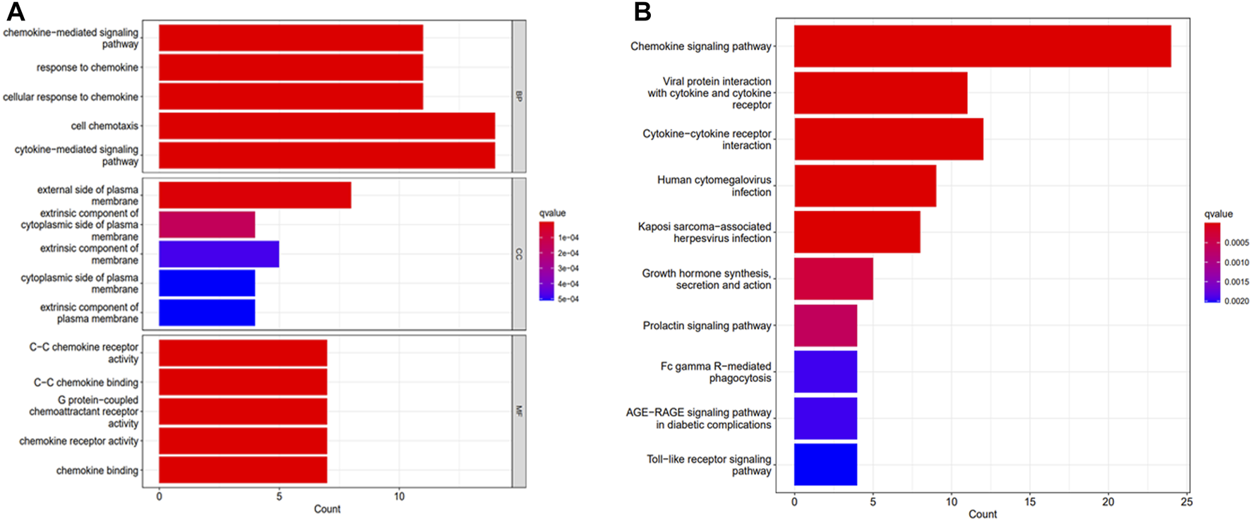 All DEGs were functionally enriched, and 5 GO keywords were exhibited in the GO bar plot according to p < 0.05 (Figure 2A; Supplementary Table S1). The results showed that the enrichment of biological processes (BP) was mainly related to chemokine-mediated signaling pathways, cellular responses to chemokines, and cellular chemotaxis. Molecular functions (MF) were related to chemokine receptor activity and chemokine binding such as C- C chemokine receptor and G protein-coupled chemokine receptor. The cellular component (CC) related to the outer side of the plasma membrane. Results of KEGG analysis showed an association with chemokine signaling pathways, viral protein-cytokine and cytokine receptor interactions, cytokine-cytokine receptor interactions, human cytomegalovirus infection and Kaposi’s sarcoma-associated herpesvirus infection (Figure 2B; Supplementary Table S2).