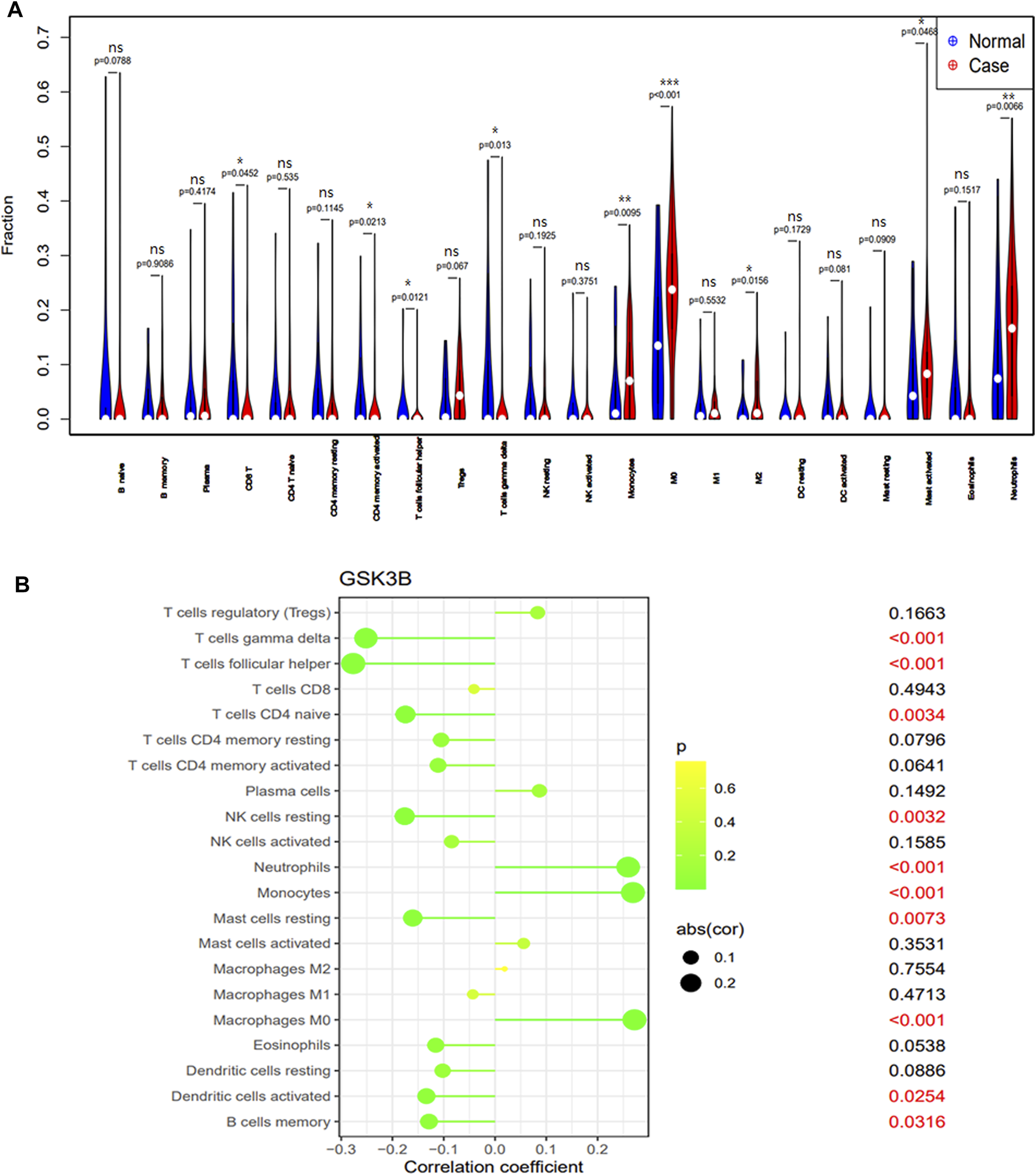 The immune cell infiltration association with signature genes. (A) The immune cell infiltration between the sepsis patient and healthy cohort. (B) The association between the signature gene GSK-3β and significantly different immune cell infiltration. “ns” means p ≥ 0.05, *p < 0.05, **p < 0.01, and ***p < 0.001.