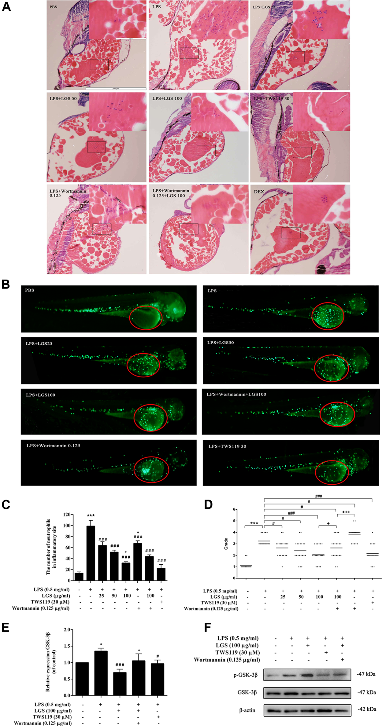 LGS inhibits LPS-induced neutrophil inflammatory infiltration by suppressing GSK-3β expression in zebrafish. 3dpf larvae yolk-microinjected with 0.5 mg/mL LPS or PBS, and then treated with DEX (5 μg/mL) or LGS (25, 50, 100 μg/mL) or TWS119 (30 μM) or Wortmannin (0.125 μg/mL). After 12 hpi, larvae were dehydrated and embedded in paraffin for H&E staining assay (A), ×100); Representative fluorescence images (B), red circle), Statistical analysis (C) and inflammatory grading scatter diagrams (D) of neutrophils in yolk were shown; The mRNA expression level of GSK-3β was determined by q-PCR (E) The protein expressions of p-GSK-3β (Ser9) and GSK-3β were measured by Western blot (F). Data are presented as mean ± SEM, n = 3, LPS group vs. blank group, *p < 0.05; vs. LPS group, ###p < 0.0001, #p < 0.05; vs. LPS + LGS group, +p < 0.05.