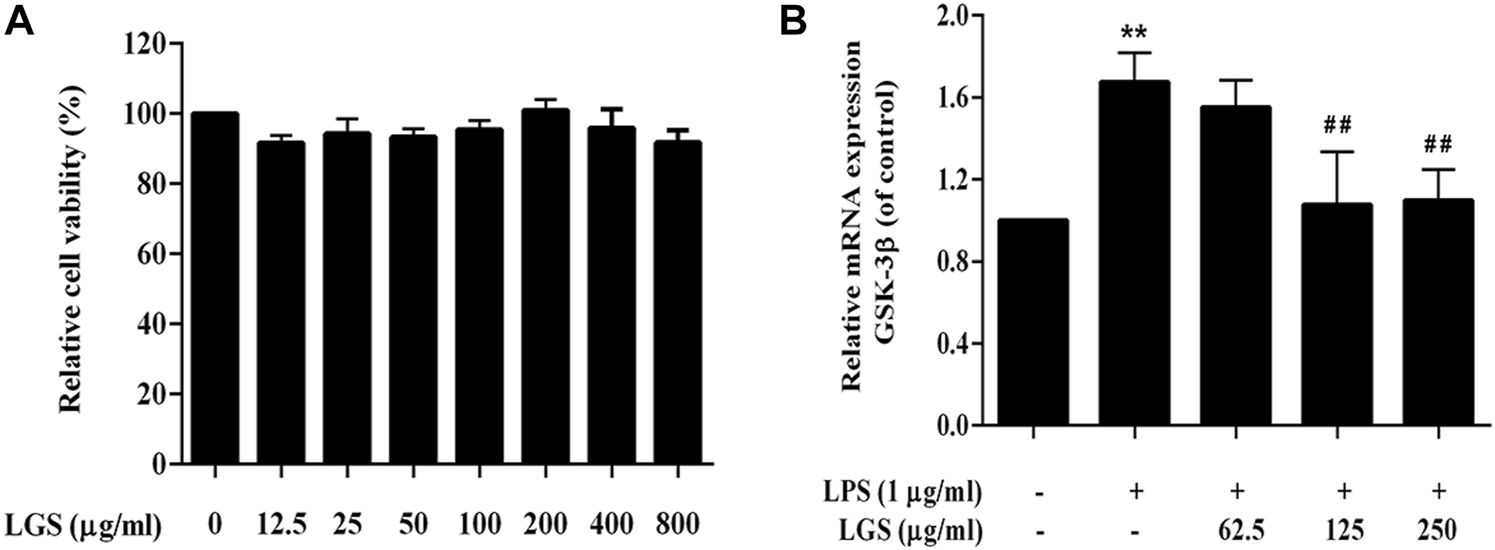 LGS depressed the expression of GSK-3β in LPS-induced macrophage inflammation. (A) LGS (12.5–800 μg/mL) showed no significant cytotoxicity in RAW264.7 macrophages. Cell survival was detected by MTT assay. (B) Comparison of GSK-3β expression in different treatment groups (LPS group vs. blank group, **p < 0.005; vs. LGS group, ##p < 0.005, #p < 0.05).