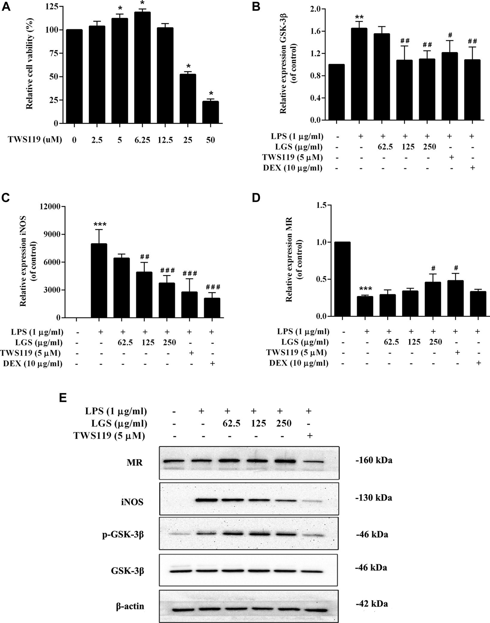 Effect of LGS on LPS-induced macrophage cell polarization. RAW264.7 cells (M0) were pre-stimulated with 100 ng/mL LPS for 48 h to obtain M1 macrophages. LGS (62.5, 125, 250 μg/mL) or TWS119 (5 μM) was co-stimulated with LPS (1 μg/mL) for 48 h. TWS119 (2.5–12.5 μg/mL) showed no significant cytotoxicity in RAW264.7. Cell survival was detected by MTT assay (A), *p < 0.05, vs. blank group). The mRNA expression level of GSK-3β, iNOS and MR were determined by q-PCR (B–D). The protein expressions of iNOS, MR, p-GSK-3β (Ser9) and GSK-3β were measured by Western blot (E). Data are presented as mean ± SEM, n = 3, *p < 0.05, ***p < 0.0001, LGS group vs. blank group; #p < 0.05, ##p < 0.001, ###p < 0.0001, vs. LGS group.
