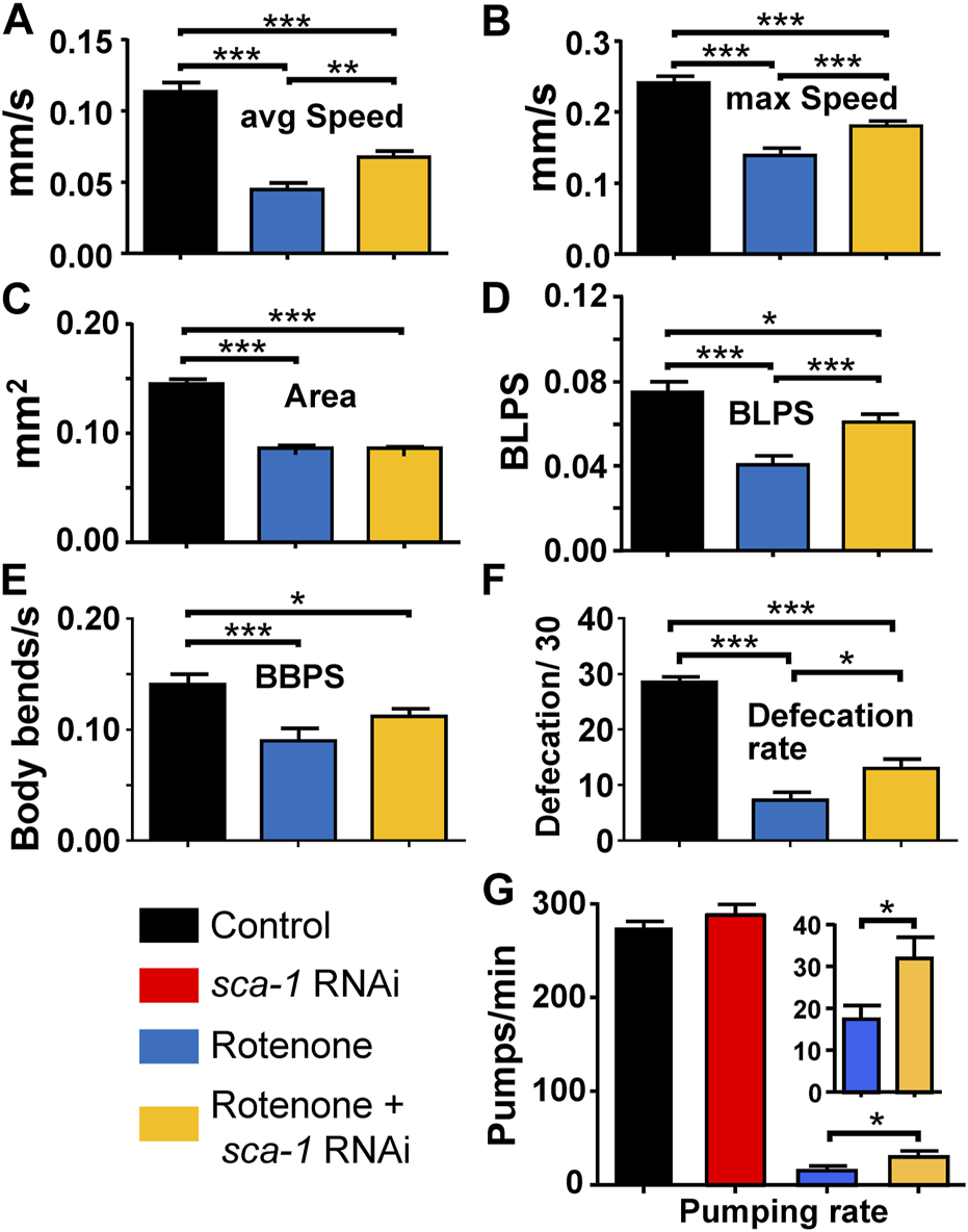 Rescue by sca-1 RNAi of the effect of rotenone on N2 C. elegans mobility and defecation. The figure shows the average speed (panel (A)), maximum speed (panel (B)), size (panel (C)), speed measured as body length per second (BLPS, panel (D), body bends per second (panel (E)), rate of defecation (panel (F)) and rate of pumping (panel (G)) in either control worms or worms treated with rotenone or rotenone and 10% sca-1 RNAi. Data are mean ± s.e.m. *, p < 0.05; ***, p < 0.005.