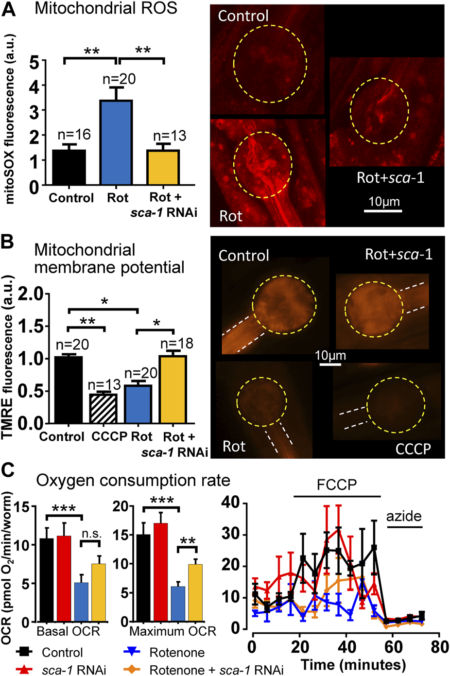 Rescue by sca-1 RNAi of the effect of rotenone on mitochondrial ROS production, mitochondrial membrane potential and oxygen consumption rate (OCR) in N2 C. elegans. Panel (A) shows mitochondrial ROS measurements with mitoSOX, panel (B) shows mitochondrial membrane potential measurements with TMRE and panel (C) shows OCR measurements, all of them obtained either in control worms or in worms treated with rotenone or rotenone and 10% sca-1 RNAi. The protonophore CCCP was also included to induce full mitochondrial membrane depolarization in panel (B). In OCR measurements, the protonophore FCCP was added to obtain the maximum rate of respiration, and azide to obtain non-mitochondrial respiration. The number of experiments made is included on top of each bar in panels (A,B). For OCR measurements, 12 experiments were made in three different days. Representative images of fluorescence of each kind are shown in the right part of the figure in panels (A,B). Data are mean ± s.e.m. *, p < 0.05; **, p < 0.01; ***, p < 0.005.