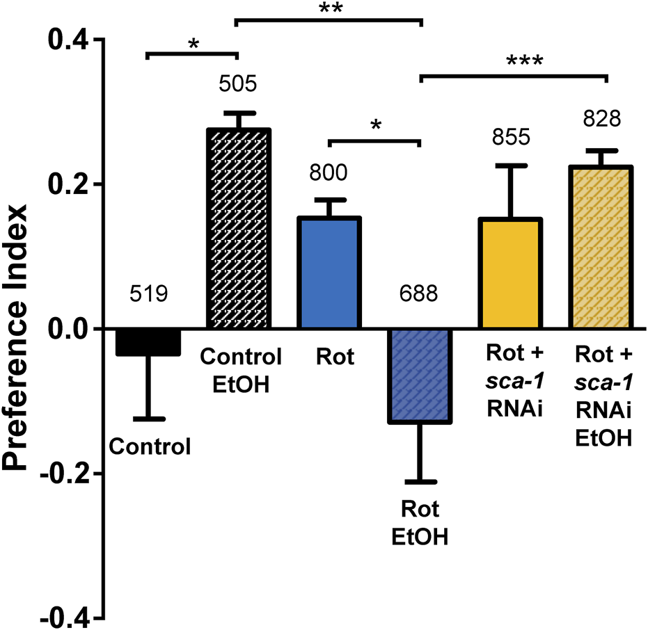 Rescue by sca-1 RNAi of the effect of rotenone on ethanol preference. The figure shows the ethanol preference index obtained in the three different conditions: control N2 worms or N2 worms treated with rotenone or rotenone and 10% sca-1 RNAi. Data are mean ± s.e.m. of 5 different experiments of each kind. *, p < 0.05; **, p < 0.01; ***, p < 0.005. Rotenone concentration was 14 µM. The number of worms tested is above each bar.