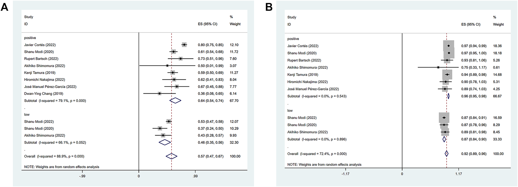 Of the 10 included articles, studies on HER2-positive patients were not used due to incomplete data, insufficient follow-up time and disease progression or death before median survival in some patients. Complete median PFS and OS data could only be extracted from the HER2 low expression studies, with one completely reporting median OS and PFS after DS-8201 administration for all patients and two reporting median OS and PFS after administration for all patients. Regarding median PFS in the low expression group, the pooled median PFS was 9.24 months in a random-effects model (95% CI: 7.54–10.94) (I2 = 52.2%; p = 0.148), and the combined median OS was 23.87 months (95% CI: 21.56–26.17) using the fixed effects model (I2 = 46.6%; p = 0.171). The three included studies had a relatively long follow-up period for patients and the overall qualitative assessment of the literature was high and informative. The results of the analysis are detailed in Supplementary Figure S1.