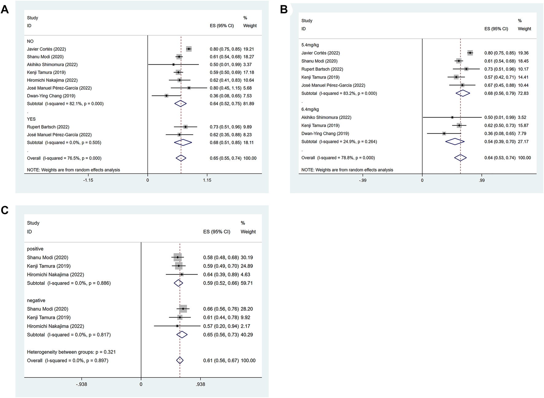 Forest plots of the pooled results of the different subgroup analysis in the HER2-positive expression group. (A) ORR for subgroup analysis of whether active brain metastasis, (B) ORR for drug dose subgroup analysis, (C) ORR for subgroup analysis of hormone receptor status.