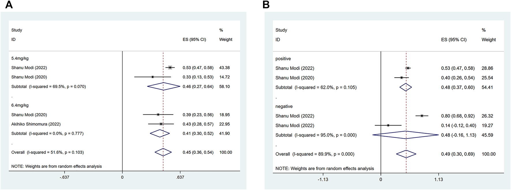 Forest plots of the pooled results of the different subgroup analysis in the HER2 low expression group. (A) ORR for drug dose subgroup analysis, (B) ORR for subgroup analysis of hormone receptor status.