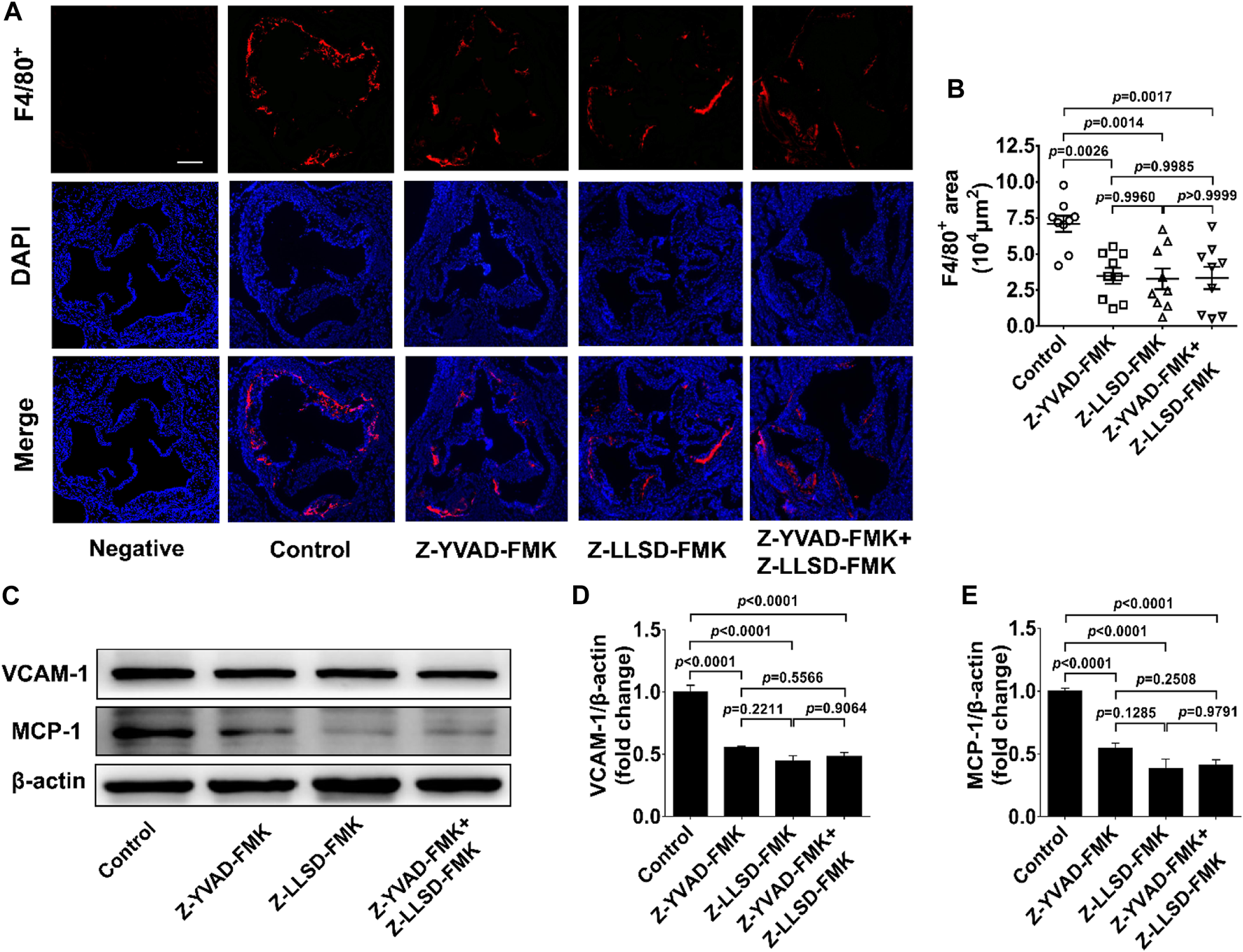Inhibition of GSDMD activation alleviated vascular inflammation in ApoE−/− mice. The ApoE−/− mice were killed at 18 weeks and aortas were acquired. (A) Accumulation of macrophages in atherosclerotic lesions in the aortic sinus was detected by immunofluorescent staining of F4/80+ (red) and DAPI (blue), and representative images are shown (scale bar = 200 μm). (B) Quantification of the positive area of F4/80+ macrophages in atherosclerotic lesions (n = 9). (C) Western blotting analysis was performed to examine the protein levels of VCAM-1 and MCP-1 in aortas from the indicated mice. (D,E) Quantitative analysis (n = 6). β-actin served as a loading control. Data represent means ± SEM.