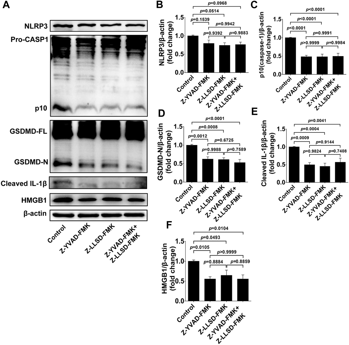 To further confirm the inhibitory effects of Z-LLSD-FMK, Z-YVAD-FMK, and the two combined on GSDMD activation or pyroptosis in vitro, BMDMs were pretreated with Z-LLSD-FMK, Z-YVAD-FMK, or both for 30 min then primed with LPS for 4 h followed by nigericin for 30 min. Cell death was then determined via staining with PI/Hoechst 33342 and LDH release in supernatants. IL-1β release in supernatants and protein levels of pyroptosis pathway-related proteins both in supernatants and cell lysates were also detected. Compared with the vehicle-treated group, the percentage of PI-positive BMDMs, release of LDH and IL-1β in supernatants, and protein levels of NLRP3, p10 (caspase-1), GSDMD-N, cleaved IL-1β, and HMGB1 in supernatants and cell lysates were significantly elevated in the LPS + nigericin-stimulated group (Figures 5A–J). Remarkably, compared with the control group the percentage of PI-positive BMDMs, release of LDH and IL-1β, protein levels of NLRP3, p10 (caspase-1), GSDMD-N, cleaved IL-1β, and HMGB1 in supernatants, and protein expression of p10 (caspase-1), GSDMD-N, cleaved IL-1β, and HMGB1 in cell lysates were significantly lower in the LPS + nigericin-stimulated groups that were pretreated with Z-LLSD-FMK, Z-YVAD-FMK, or both (Figures 5A–J). However, compared with the control group, protein expression of NLRP3 in cell lysates was slightly decreased in the LPS + nigericin-stimulated groups pretreated with Z-LLSD-FMK, Z-YVAD-FMK, or both (Figures 5E, F).