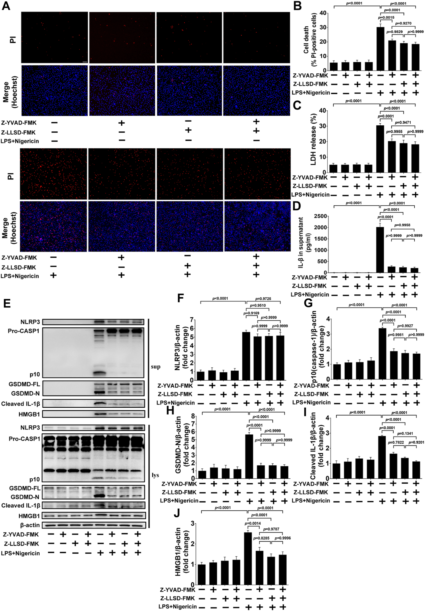 Z-LLSD-FMK or Z-YVAD-FMK inhibited GSDMD activation or pyroptosis induced by LPS + nigericin in BMDMs. BMDMs were primed with LPS for 4 h followed by nigericin for 30 min. Z-LLSD-FMK, Z-YVAD-FMK, and both combined were added 30 min before LPS + nigericin treatment. (A) Representative immunofluorescence images of cell death determination via PI (red) and Hoechst 33342 (blue) staining (scale bar = 75 μm). (B) The percentage of PI-positive BMDMs was calculated at five randomly selected image fields (n = 5). (C) LDH release in supernatants (n = 5). (D) IL-1β release in supernatants was analyzed by ELISA (n = 5). (E) Western blotting analysis was performed to detect protein levels of NLRP3, caspase-1, GSDMD, cleaved IL-1β, and HMGB1 in supernatants and cell lysates. (F–J) Quantitative analysis of expression of NLRP3, p10 (caspase-1), GSDMD-N, cleaved IL-1β, and HMGB1 in cell lysates (n = 5). β-actin served as the loading control. Data represent means ± SEM.
