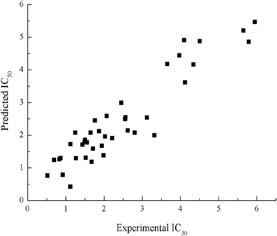 R2cv is 0.82; F = 58.65, p < 0.001. The R2, S2 values for the training set in this model are 0.87 and 0.29, values for the testing set are 0.78 and 0.53, respectively. The scatter plot of experimental and predicted IC50 by HM model is shown in Figure 2.