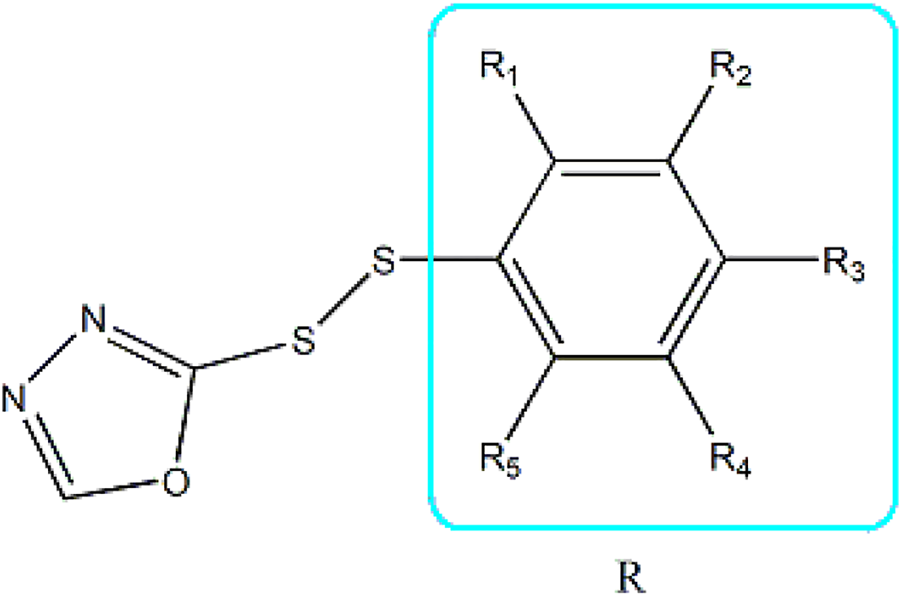 Based on these four factors, the ideal inhibitor structures may be obtained by changing the structural composition of compound 31 (the most potent compound in the literature). The molecular structure adjustments were concentrated in the R region, as shown in Figure 3. There are 6 C atoms in the benzene ring, which is relatively beneficial for the improvement of the Balaban index and the change distribution of different charges. Some Chemical functional groups were introduced and randomly combined at positions R1 to R5 to the reduce the polar interactions between atoms, such as halogen elements, hydroxy, carboxyl, aldehyde group and hydrocarbyl. Furthermore, different forms of C and N atoms have also been involved.