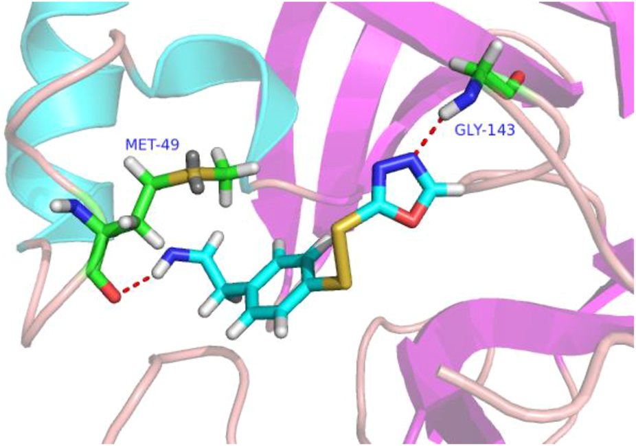 FIGURE 4. Docking assay of compound 31a with SARS-CoVs Mpro related target (PDB ID: 2AMD). In the images of residues Met-49 and GLY-143, carbon atoms are shown in green, oxygen atoms in red, nitrogen atoms in blue, sulfur atoms in yellow, hydrogen atom in white. The red dash lines show the bonding reaction between compound 31a and residues.