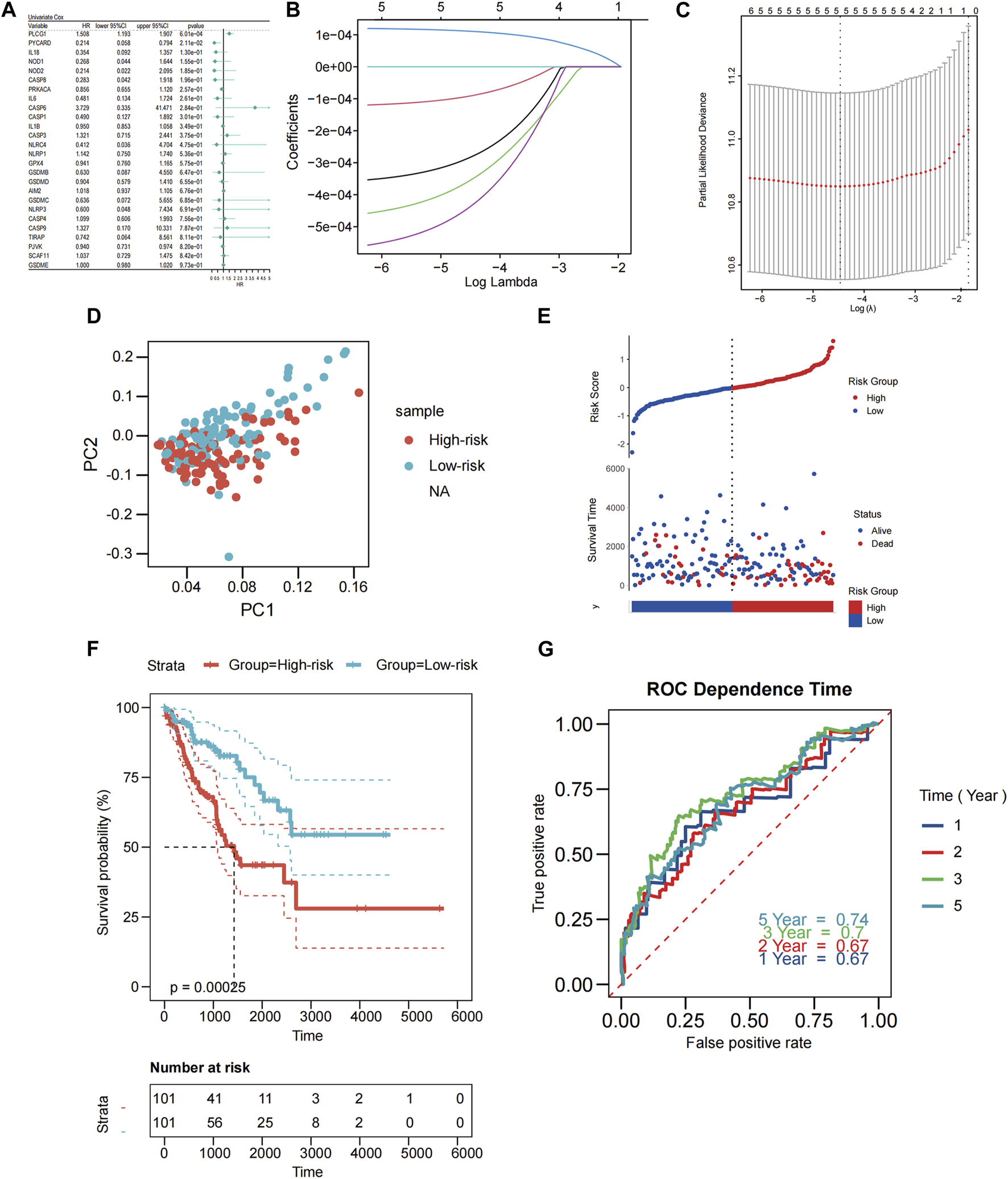 Construction of PRGs-risk model in the patients from TCGA cohort. (A) Univariate cox regression analysis of OS for each pyroptosis-related gene, and 5 genes with p < 0.2. (B) LASSO regression of the six OS-related genes. (C) Cross-validation for tuning the parameter selection in the LASSO regression. (D) PCA plot for STS based on the risk score. (E) Scatterplots in the top and bottom panels illustrate the distribution of the risk score and survival status of patients in the TCGA cohort, respectively (low-risk population: on the left side of the dotted line; high-risk population: on the right side of the dotted line). (F) The Kaplan-Meier curves of OS for patients in the low-risk and high-risk groups. (G) The time-dependent ROC curves demonstrated the predictive efficiency of the risk score.