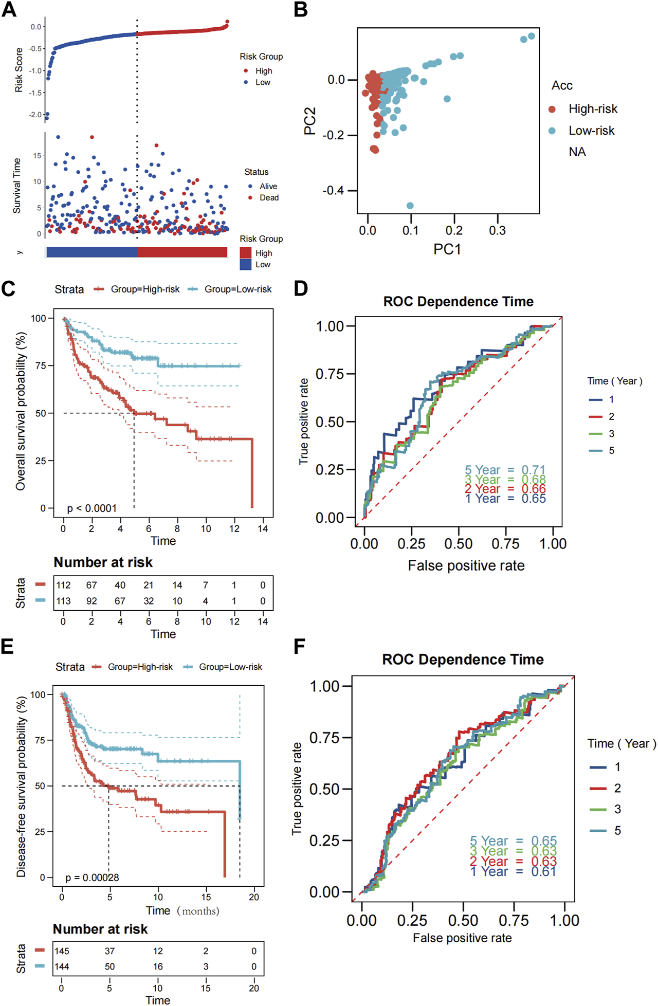 External validation was performed on 290 patients from GSE21050 for RFS and 226 patients from GSE30929 and GSE63157 for OS. Prior to further analysis, we normalized gene expression data using the “Combat” program to eliminate batch effects. The TCGA cohort algorithm was applied to produce the risk scores, categorizing the patients into low- and high-risk categories from their median scores. Those belonging to the former group had a longer lifespan and smaller rate of mortality compared to the latter group (Figure 3A). The PCA results indicated that the two groupings were sufficiently distinct (Figure 3B). Additionally, Kaplan-Meier analysis revealed significant differences in OS and DFS between the low- and high-risk groups ((both p < 0.001; Figure 3C; Figure 3E). As illustrated in Figure 3D and Figure 3F, our model exhibited a high predictive value (AUC for OS: 0.65 for 1 year, 0.66 for 2 years, 0.68 for 3 years, 0.71 for 5 years; AUC for RFS: 0.61 for 1 year, 0.63 for 2 years, 0.63 for 3 years, 0.65 for 5 years).