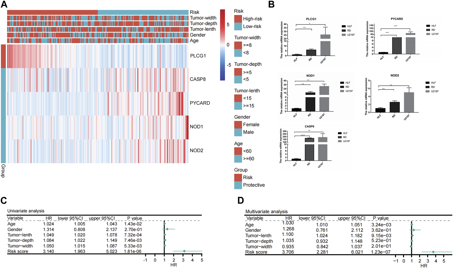 Univariate and multivariate Cox regression analyses for the PRGs-risk score. (A) Heatmap depicting five genes different expression in high- and low- PRGs-risk and the corrlection with clinical characteristics. (B) Results of qRT-PCR analysis. (C) Univariate analysis of the clinicopathological features and the risk score for the TCGA cohort. (D) Multivariate analysis of the clinicopathological features and the risk score for the TCGA cohort.