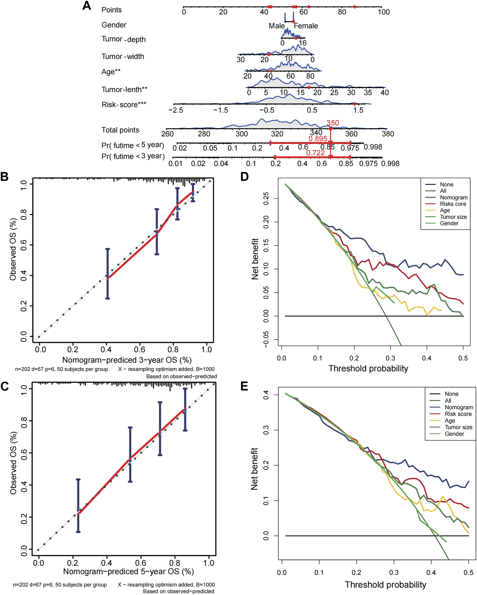 Establishment of nomogram for soft tissue sarcoma patients in the TCGA cohort. (A) The nomogram for predicting overall survival(OS) of soft tissue sarcoma patients based on combination of risk score and clinical features. (B–C) The calibration curves of nomogram regarding 3 years-OS and 5 years-OS. (D–E) The decision curve analyses for nomogram. X-axis represents threshold probabilities, and Y-axis measures net benefit.
