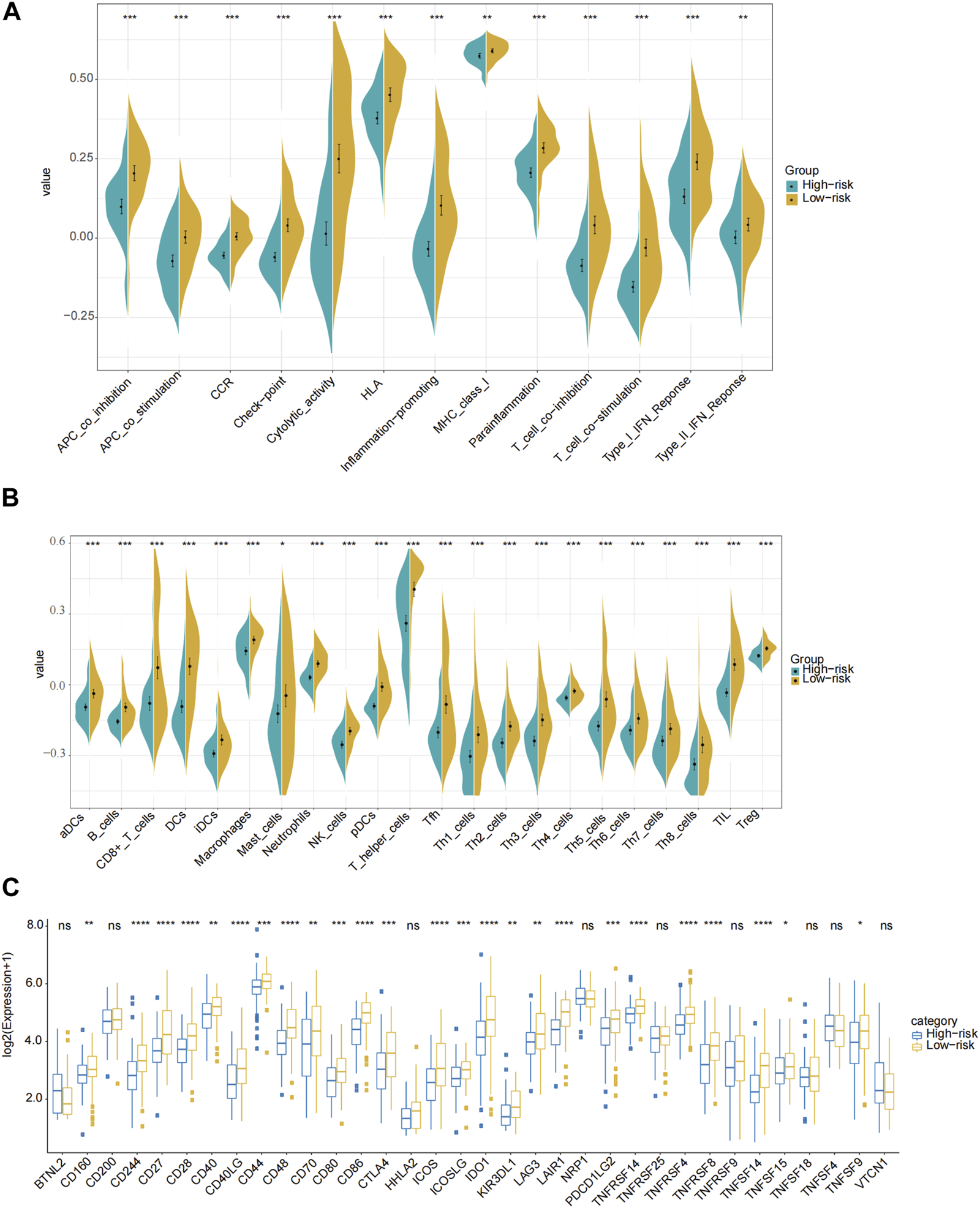 Comparison of the ssGSEA scores for immune pathways, immune cells and immune check points in the TCGA cohort. (A) Comparison of the enrichment scores of 13 immune-related pathways between the low-risk (yellow box) and the high-risk (blue box) groups. (B) Comparison of the infiltration of 24 types of immune cells between the low-risk (yellow box) and the high-risk (blue box) groups. (C) Comparison of the expression of different immune checkpoints between the low-risk and the high-risk groups in the TCGA cohort. P values were showed as: ns not significant; * p < 0.05; ** p < 0.01; *** p < 0.001; **** p < 0.0001.