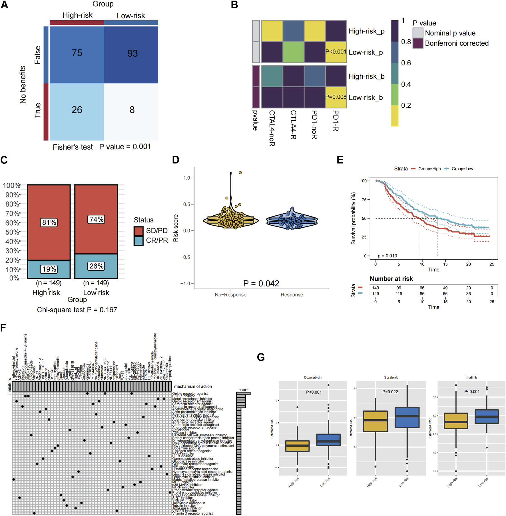 Relationship between PRGS risk score and antitumor drug sensitivity and immunotherapy response. (A) Compared different PRGs-risk group benefit from ICIs according to TIDE. (B) Subclass mapping analysis for predicting the likelihood of response to ICI therapy of patients with different PRGs-risk score. (C) The proportion of patients in the IMvigor210 cohort with different responses (PR + CR vs. PD + SD) to PD-L1 blockade immunotherapy. (D) The difference in the PRGs-risk score between the non-response and the response groups in the IMvigor210 cohort. (E) Kaplan-Meier graphs depicting patients’ overall survival (OS) in the high-risk (red) and low-risk (blue) categories following PD-L1 immunotherapy in the IMvigor210 cohort. (F) Potential targets of compounds and corresponding signaling pathway were employed in the CMAP database. (G) The boxplot showed a significant difference in doxorubicin (p < 0.001), sorafenib (p = 0.022), and imatinib (p < 0.001) IC50 values predicted by the pRRophetic method using the GDSC database between the high PRGs-risk group and the low PRGs-risk group.