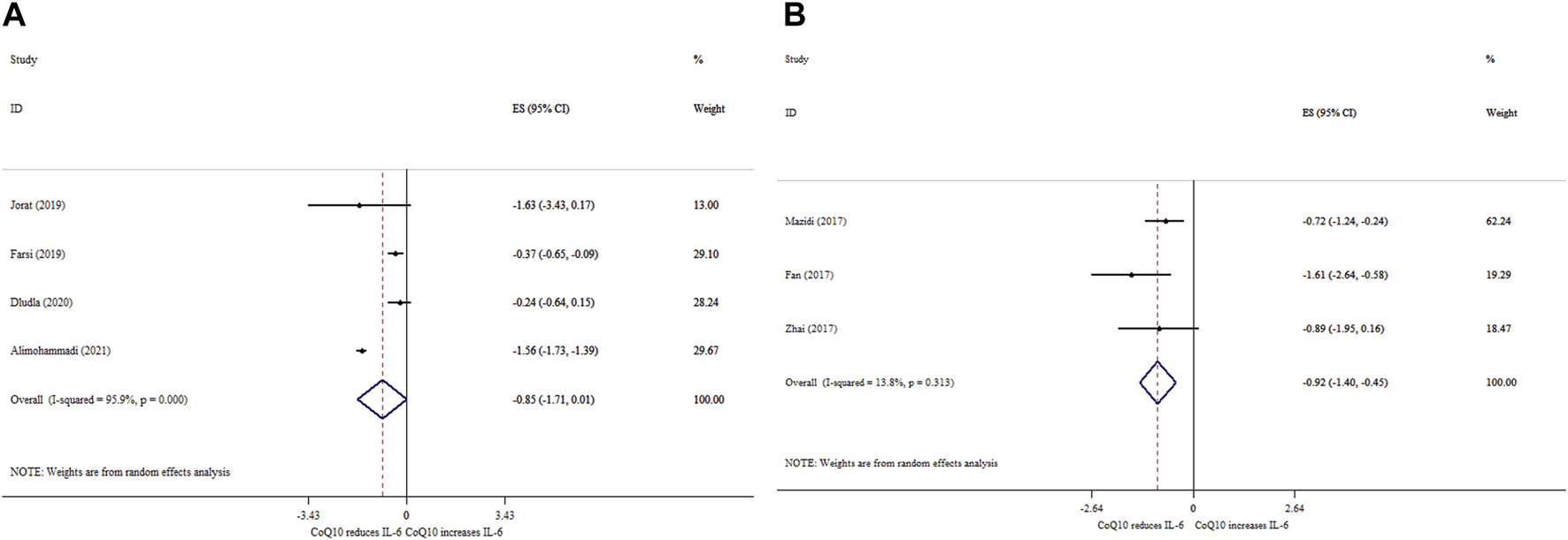 FIGURE 3. Forest plot of impacts of CoQ10 supplementation on IL-6 based on SMD (A) and WMD (B) analysis.
