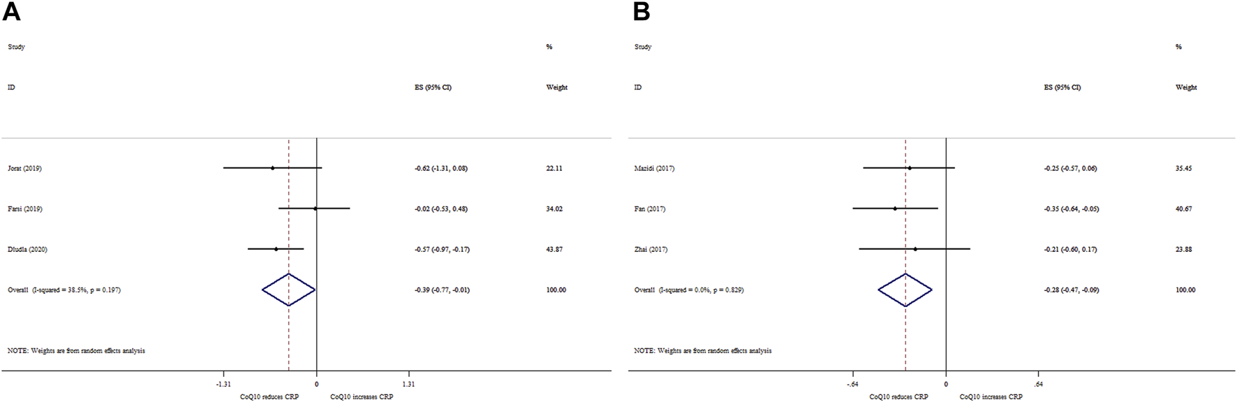 FIGURE 4. Forest plot of impacts of CoQ10 supplementation on CRP based on SMD (A) and WMD (B) analysis.