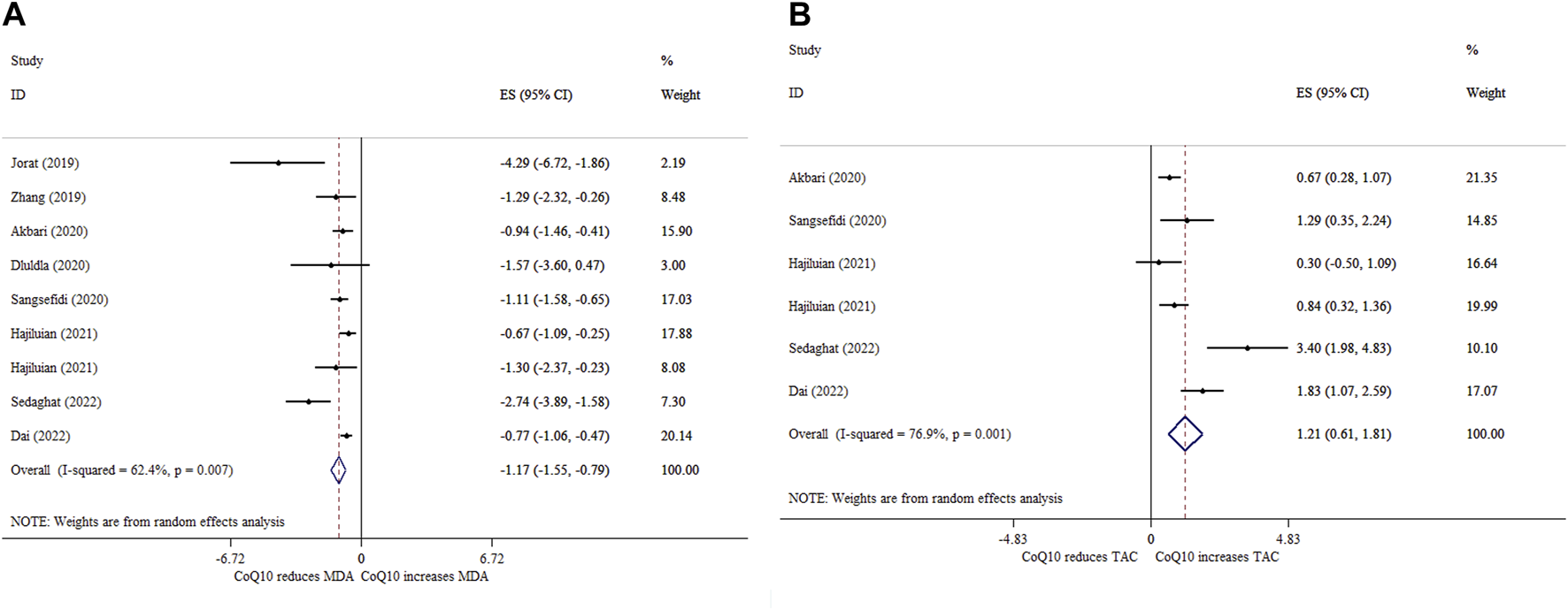 FIGURE 5. Forest plot of impacts of CoQ10 supplementation on MDA (A) and TAC (B) levels based on SMD analysis.