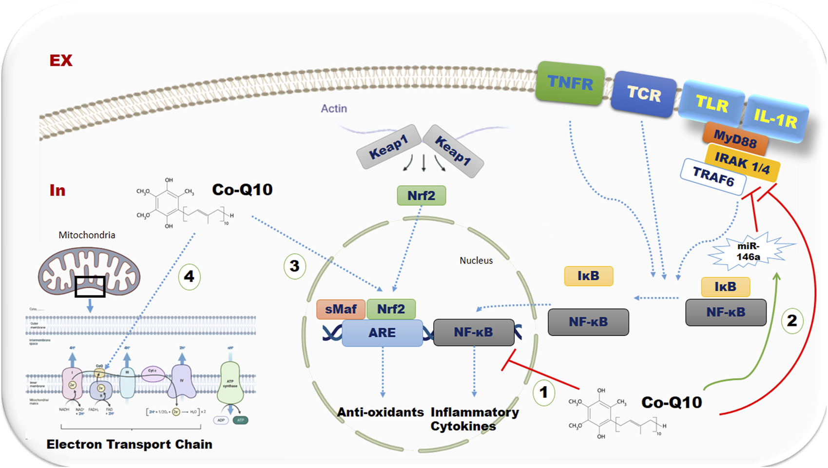 FIGURE 7. The possible mechanisms of CoQ10 supplementation on inflammatory and oxidative stress biomarkers Abbreviations: TNFR, TNF receptor; ,TLRs, Toll-like receptors; TCR, T lymphocyte receptor; Keap 1, kelch-like ECH-associated protein 1; Nrf2, nuclear factor (erythroid-derived 2)-like 2; NF-kB, nuclear-factor-Kappa-B; IKB, I-kappa-B; miR-146a, microRNAs-146a; MYD88, Myeloid differentiation primary response 88; IRAK4, Interleukin-1 receptor–associated kinase 4; TRAF6, TNF receptor associated factor 6