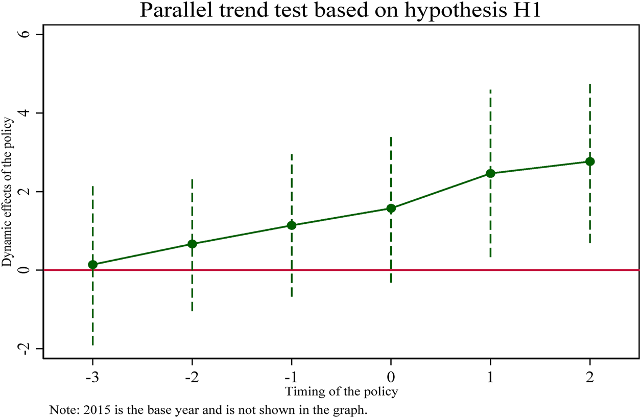 A particularly important assumption for the use of double difference models (DID) is that “parallel trends” are satisfied. Whether using graphs, regressions, or descriptive statistics, it needs to be shown that the experimental and control groups must be comparable before a shock or policy occurs. This is because the performance of the control group is assumed to be the counterfactual of the experimental group. It can be visually reflected that the coefficients of the double interaction terms (coeff 2016, coeff2017, coeff2018) before the implementation of the pooling policy in 2019 are not significant, indicating that the trend of change in the treatment and control groups before the implementation of the pooling policy is the same and there is no significant difference. The coefficient of the double interaction term in 2019 after implementation is marginally insignificant. The coefficients of the double interaction terms in subsequent years (coeff2020, coeff2021) are significantly different from zero, indicating that the selected pharmaceutical enterprises in the treatment group have a greater intensity of innovation input than the non-selected pharmaceutical enterprises in the control group. Therefore, the DID model used in this study satisfies the parallel trend assumption and the effect of policy implementation has some persistence.