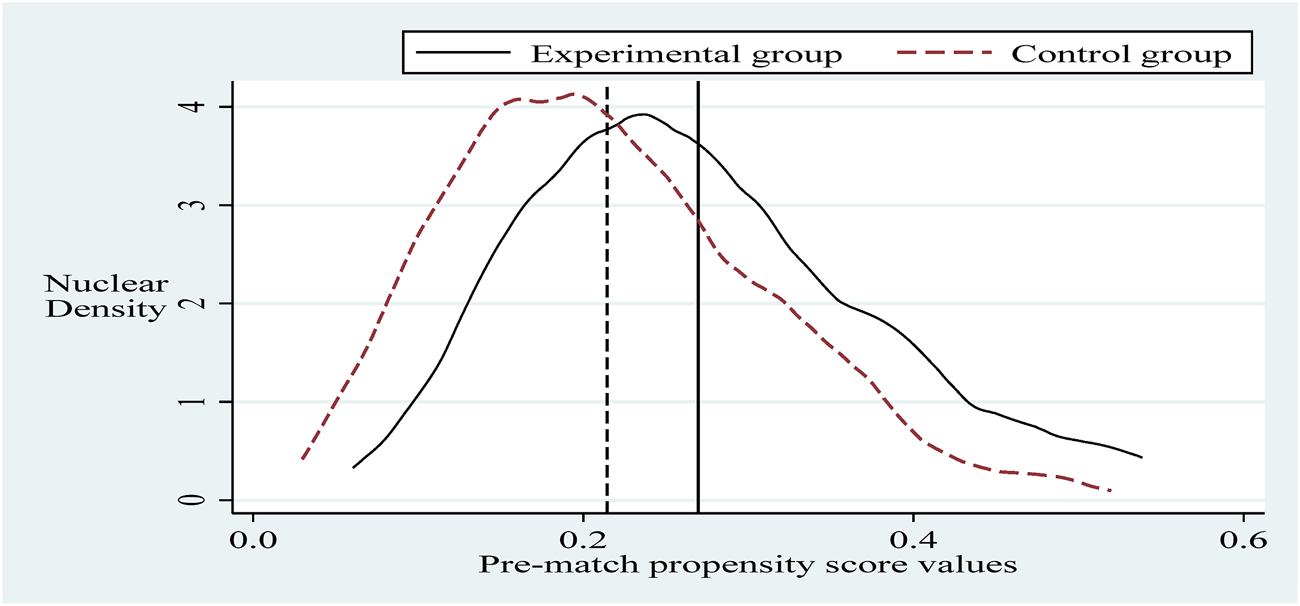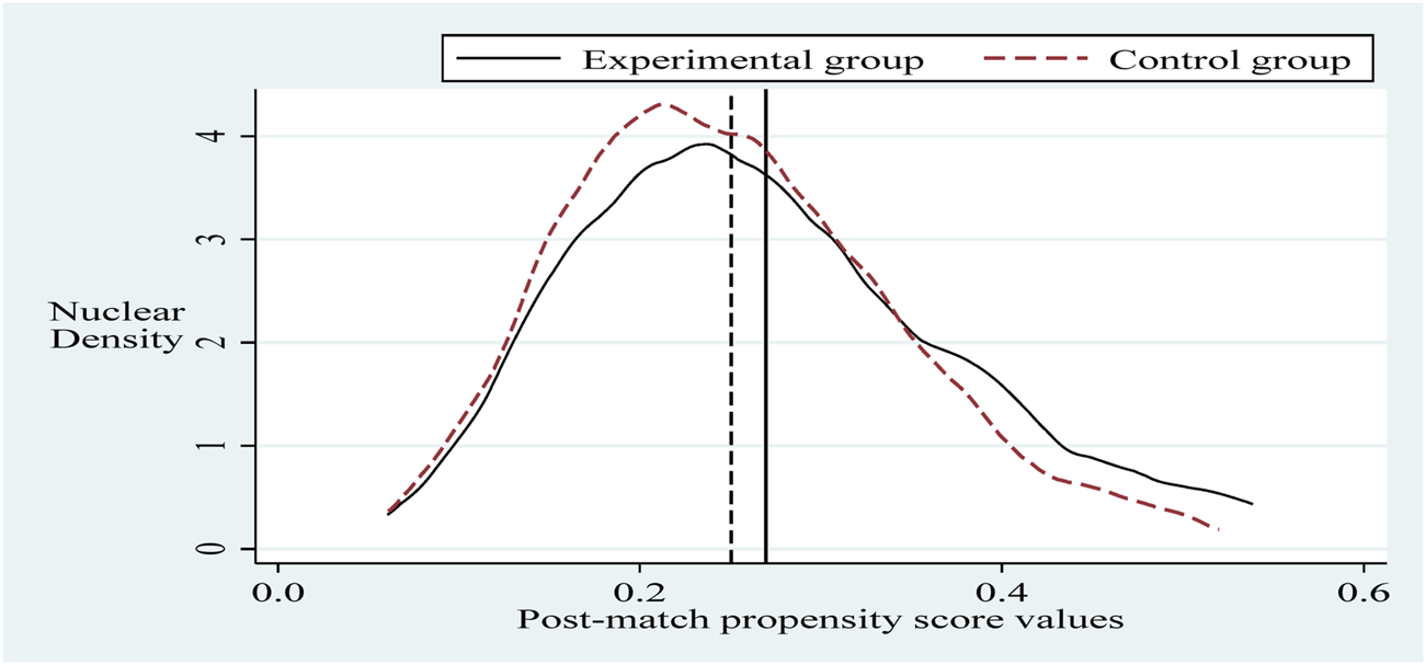 To alleviate the problem of sample selection bias, this section refers to the practice of Sun and Ge. Further, it applies the propensity score matching-dual difference (PSM-DID) method (PSM nearest neighbor matching is the process of finding one or more individuals in the control group for each individual in the experimental group to match with.) with a 1:2 nearest neighbor matching method without put-back for robustness testing (Based on the sample size of the experimental group and the sample size of the control group, it is more reasonable to choose 1:2 in this paper. The reason is that if we choose 1:1, the final matching sample is smaller and the estimated variance is larger. If we choose 1:2 or 1:3 or others, the similarity between the third and fourth control group individuals matched with the experimental group individuals decreases, and thus the estimation bias increases.). Selecting the control variable in the same innovation input intensity benchmark regression as the matching variable and setting the caliper to 0.01, applying the Logit method was used for probability estimation. Propensity scores were obtained before and after matching (Sun and Ge, 2021). It can be seen that there is a specific selection bias between the sample treatment group and the control group before matching, and after matching, the sample treatment group is the same as the control group, as shown in Figures 2, 3. Next, hypothesis H1 was re-estimated for the sample after eliminating the selection bias, and the results are shown in column (Burns, 2022) of Table 5. The policy dummy variable reaches the 1% level of positive significance. The results of the robustness test are consistent with the previous section.