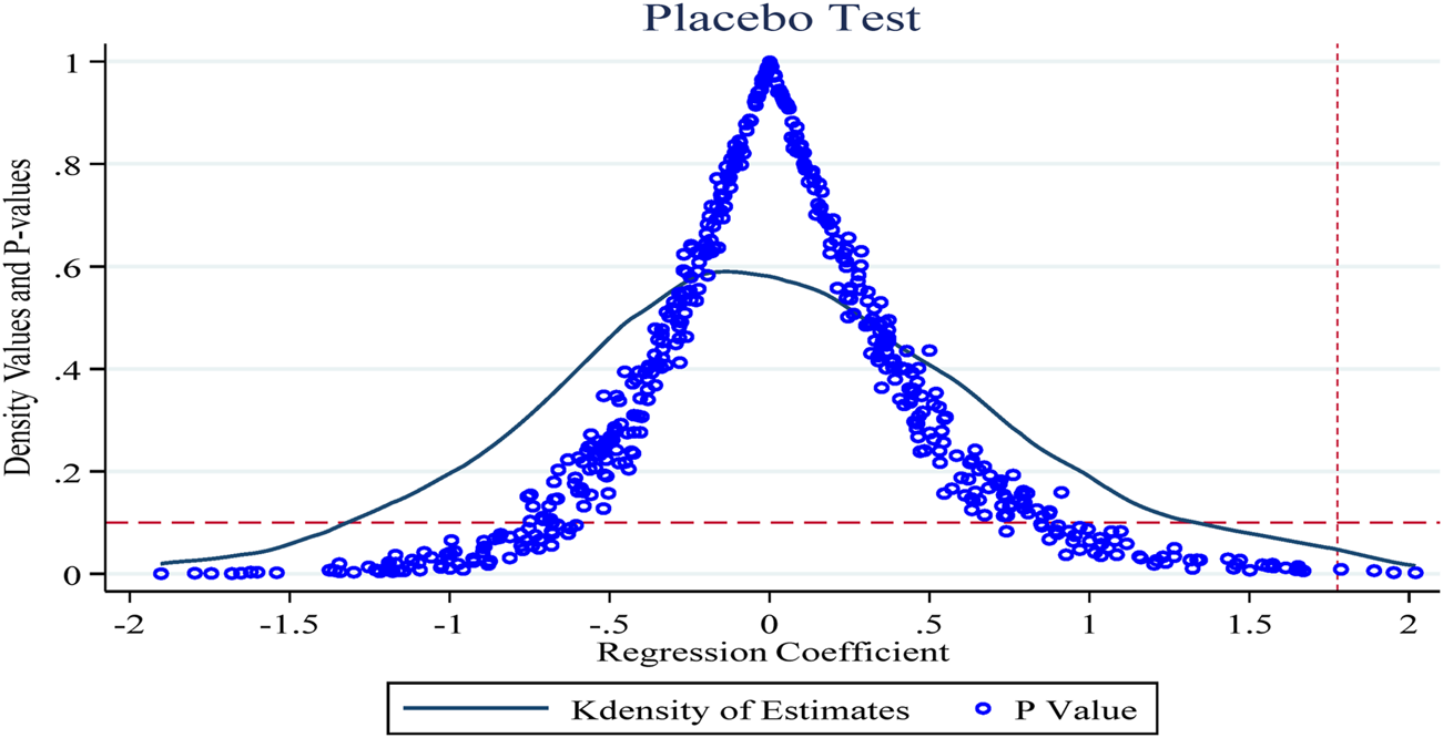 To exclude the effects of endogeneity of policy shocks and individual firm heterogeneity on the study findings, this section conducts a placebo test repeated 500 times concerning Ningbo et al. (Ning et al., 2020). Figure 4 shows the results of the placebo test with the innovation R&D input intensity indicator as the explanatory variable. The horizontal and vertical coordinates of the dots in the figure indicate the coefficients and p-values of the policy dummy variables in the random combination case, and the curves show the kernel density distribution of the estimated coefficients, with the horizontal dashed line being the significance level of 0.1 and the vertical dashed line being the true estimate of the double-difference model of 1.775 (the baseline regression Table 3 column 6 of the policy coefficient estimates). As shown, the p-values for the random sample are generally above 0.1 (insignificant at the 10% level) and the coefficient estimates obtained based on the random sample are also generally smaller than those obtained in the benchmark regression, which further suggests that the results obtained in this paper are robust.