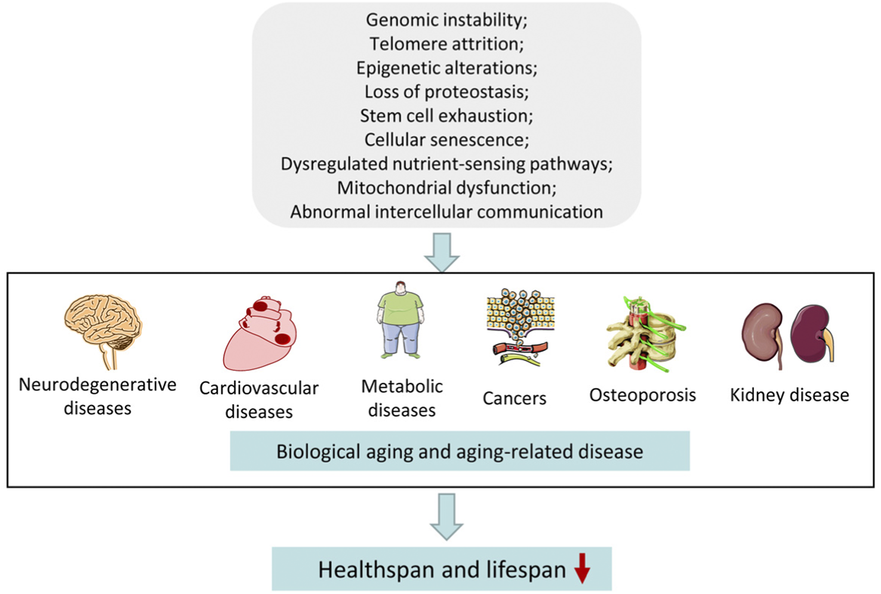Human aging is a complex, multidimensional and inevitable process that is characterized by a gradual and progressive loss of physiological integrity and functions (Jan et al., 2019). It is a recognized major risk factor that increases susceptibility to human diseases, especially in the elderly adults. As we age, functional and biological decline can remarkably affect the processes of the body system, switching the balance to massive cellular alterations and organ damages leading to aging-associated disease (Catana et al., 2018). For example, the ability of the immune system to perform its intended duties has steadily declined leading to pathological changes and functional damage. Telomere length is maximum at birth and decreases progressively with advancing age and this age associated decrease in the length of telomere is linked to various ageing associated diseases (Rizvi et al., 2014). Metabolic diseases are caused by disorders in substance anabolism and catabolism, which are closely correlated with aging (Ni and Liu, 2021). Neurodegenerative diseases are featured by a progressive loss of selective populations of vulnerable neurons and they and they can be classified as AD, Parkinson’s disease, or motor neuron disease according to the clinical characteristics, including cognitive impairment, neuroinflammation, neuron loss, β-amyloid accumulation, the collapse of proteostasis networks, and others (Hou et al., 2019).