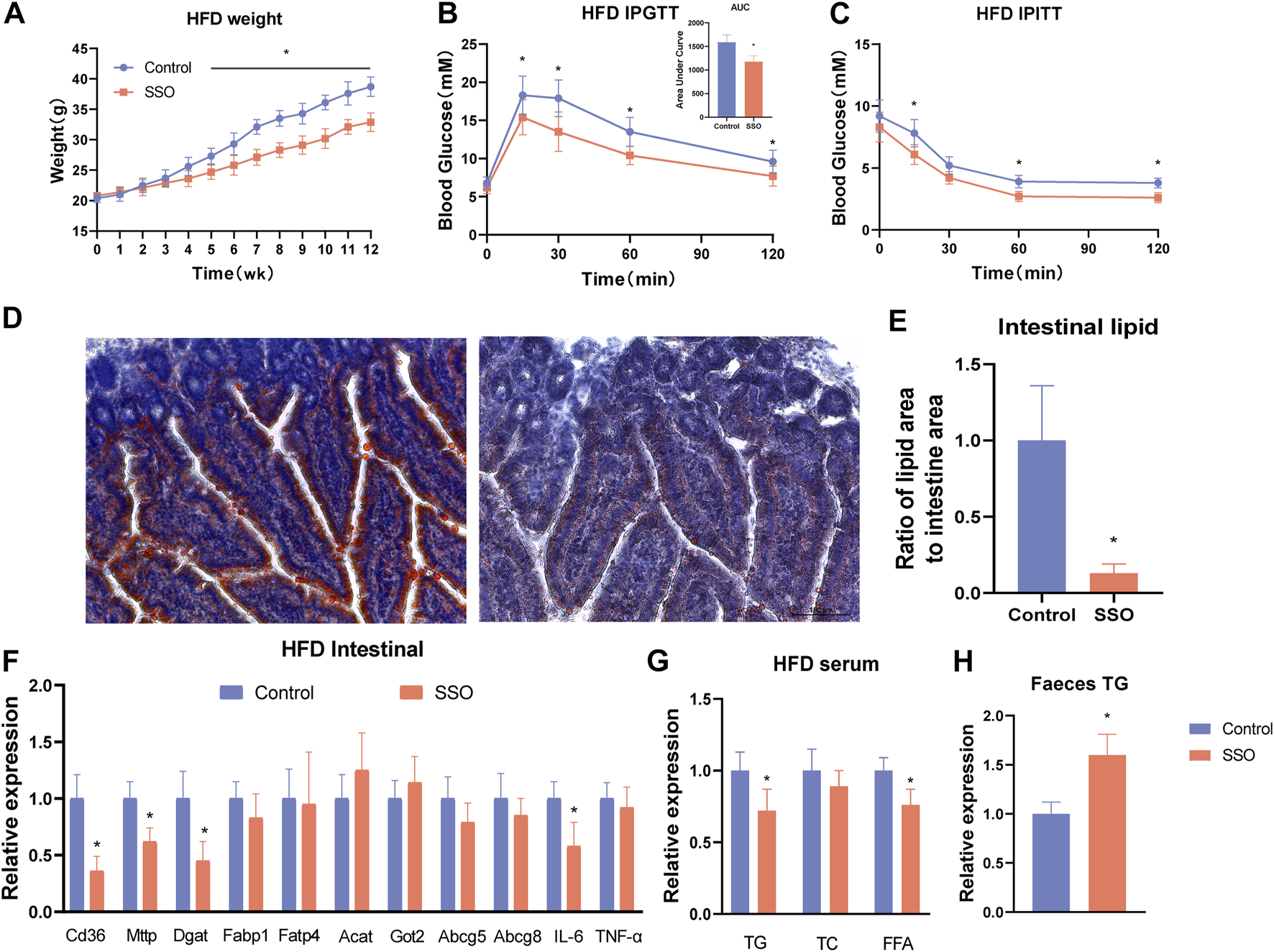 SSO treatment of a HFD-induced glycolipid metabolic phenotype in obese mice. (A) Weekly weight gain in mice on a HFD; (B) Glucose tolerance test; (C) Insulin sensitivity test; (D) Jejunum oil red staining of mice on a HFD (20 ×); (E) Lipid proportion statistics of jejunum oil red staining in mice on a HFD; (F) Lipid absorption- and inflammation-related gene expression levels in intestinal epithelial cells; (G) Serum levels of triglyceride, cholesterol, and free fatty acids in mice fed a high-fat diet; (H) Fecal triglyceride levels in mice fed a high-fat diet. Significant differences are indicated as *p-value <0.05. n = 4–6/group.
