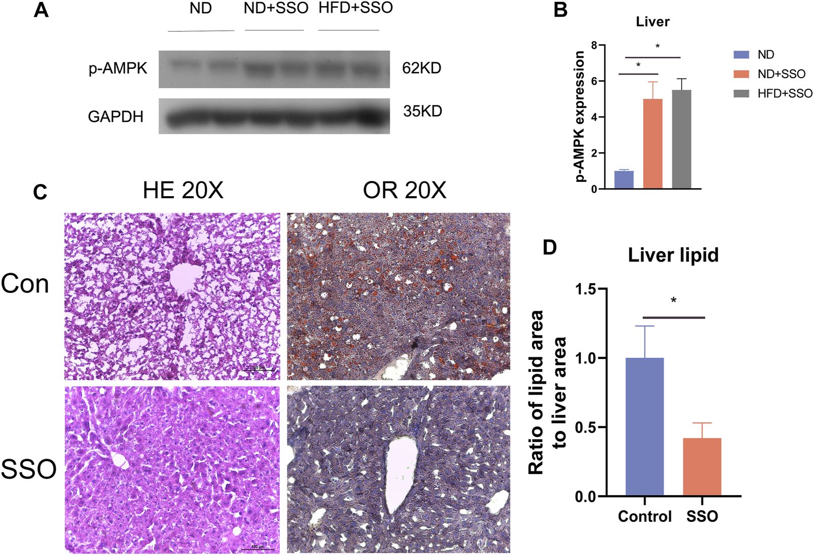To confirm the change in the liver AMPK protein expression level, we detected the liver AMPK protein of ND and HFD mice by Western blot. The results showed that SSO-fed ND or HFD mice had a higher AMPK level than controls (p < 0.05) (Figures 3A, B). These results suggest that SSO inhibits lipid synthesis by increasing the liver AMPK expression. To further investigate the effect of SSO on lipid accumulation in the liver of mice fed with HFD, liver slices were sectioned and stained with HE and oil red. The results showed that HFD-fed mice, as controls, developed severe lipid accumulation and vacuolar degeneration of the liver. In comparison, SSO-fed HFD mice exhibited significantly ameliorated hepatic steatosis. Quantitative analysis of oil red staining of the liver also showed that SSO attenuated hepatic lipid accumulation in HFD mice (p < 0.05) (Figures 3C, D). These results suggest that SSO ameliorates HFD-induced hepatic steatosis.