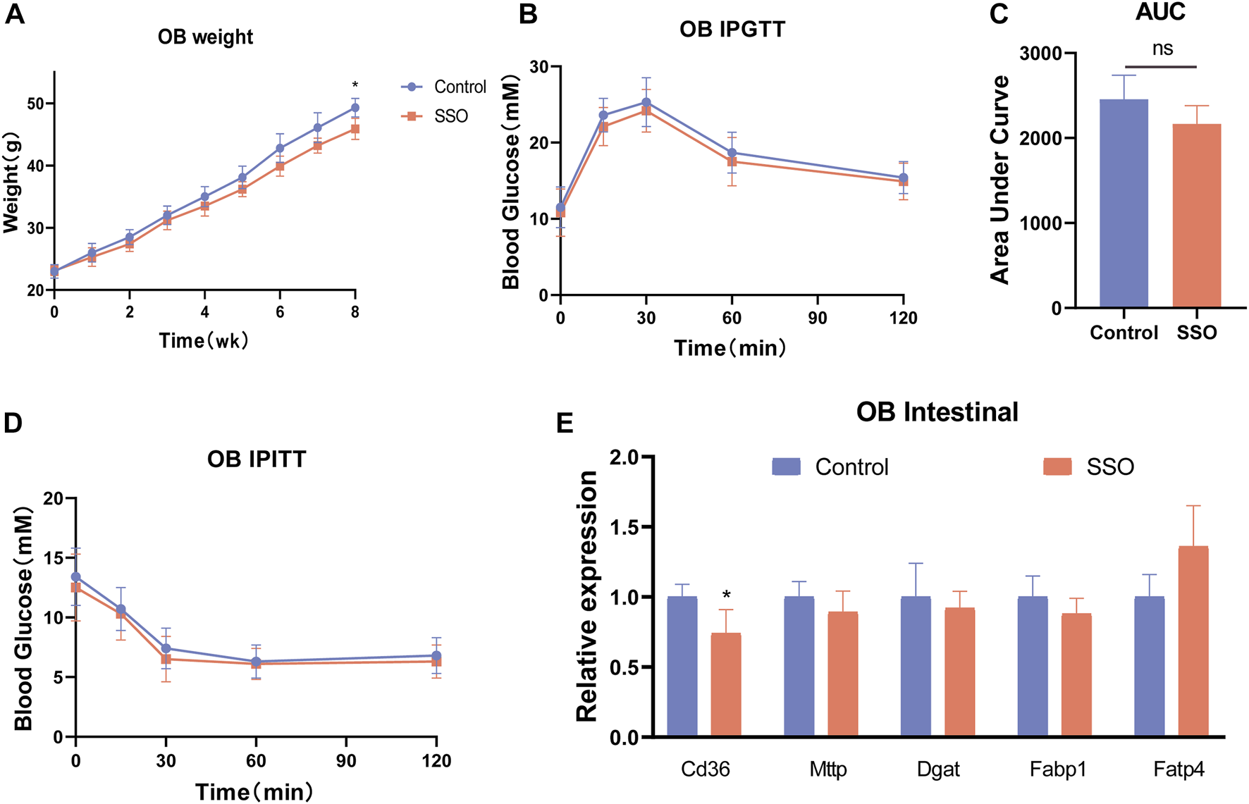 To explore the relationship between the regulation of glycolipid metabolism in mice by SSO and leptin, we used leptin-deficient mice (OB mice) as subjects for SSO feeding. The results showed that SSO-fed OB mice showed a slight weight loss (p < 0.05) at week 8 (Figure 4A). However, no differences were observed in the glucose tolerance tests and area under the curve (Figures 4B, C). Next, OB mice were tested for insulin resistance; no therapeutic effect of SSO was found in OB mice (Figure 4D). To further validate the effect of SSO on intestinal lipid absorption genes in OB mice, we dissected the jejunal epithelium of OB mice and examined the associated lipid absorption genes. The results showed that there was no difference in the lipid genes except for CD36 (Figure 4E). These results suggest that SSO has a minor effect on intestinal absorption in OB mice and is not sufficient to ameliorate or compensate for the impaired glucose and lipid metabolism associated with leptin deficiency. Figure 5.