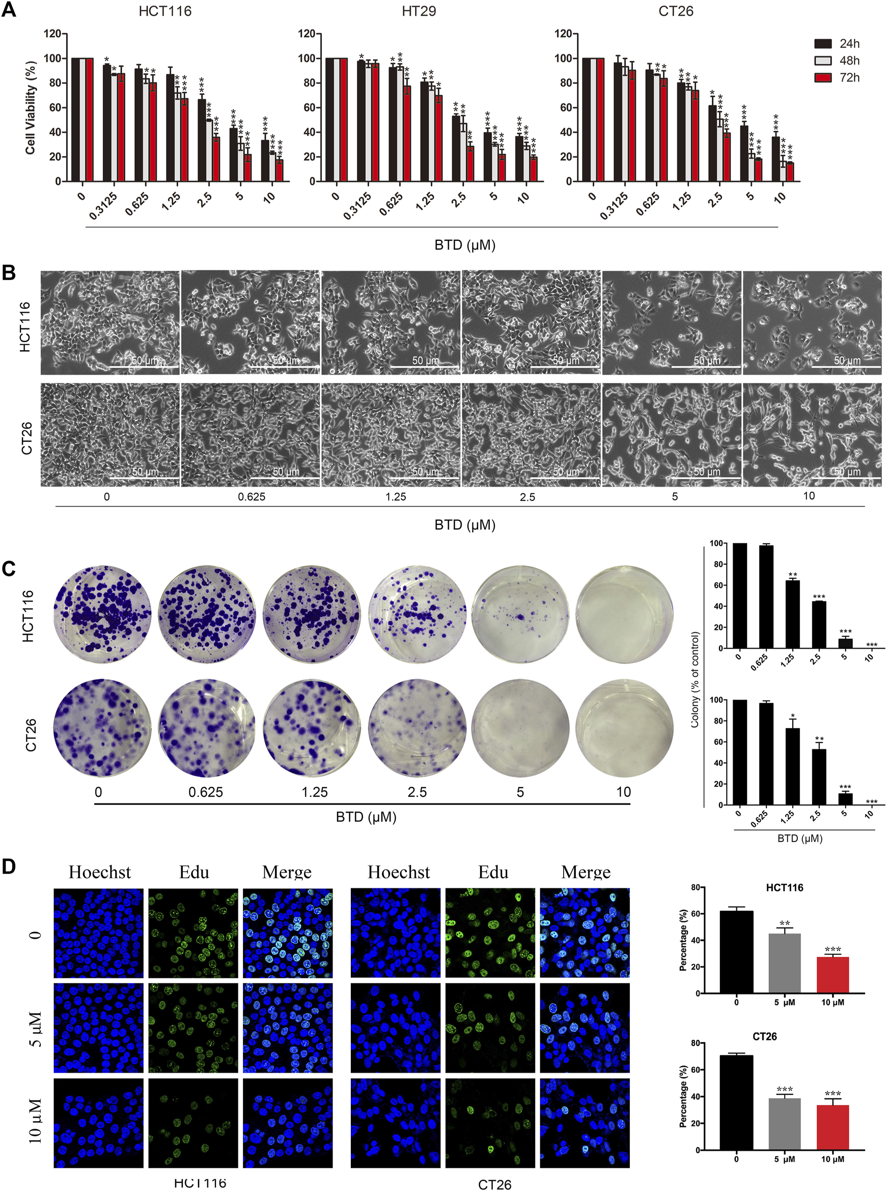 FIGURE 2. BTD suppressed cell proliferation. (A) Proliferation of HCT116, HT29, and CT26 cells was evaluated using MTT assays. Cells were treated with BTD (2.5, 5, or 10 μM) or vehicle for 24–72 h. (B) Cell morphology changes were observed by optical microscopy (×200). Cells were treated with a gradient concentration of BTD (0, 0.3125, 0.625, 1.25, 2.5, 5, and 10 μM) for 24 h. (C) Colony formation of HCT116 and CT26 cells after treatment with BTD. The results are presented as surviving colonies. (D) EdU staining assays showed the replication of DNA in HCT116 and CT26 cells treated with BTD (5 or 10 μM) or vehicle. Blue staining indicates the cell nucleus, and green staining indicates duplicated cells.