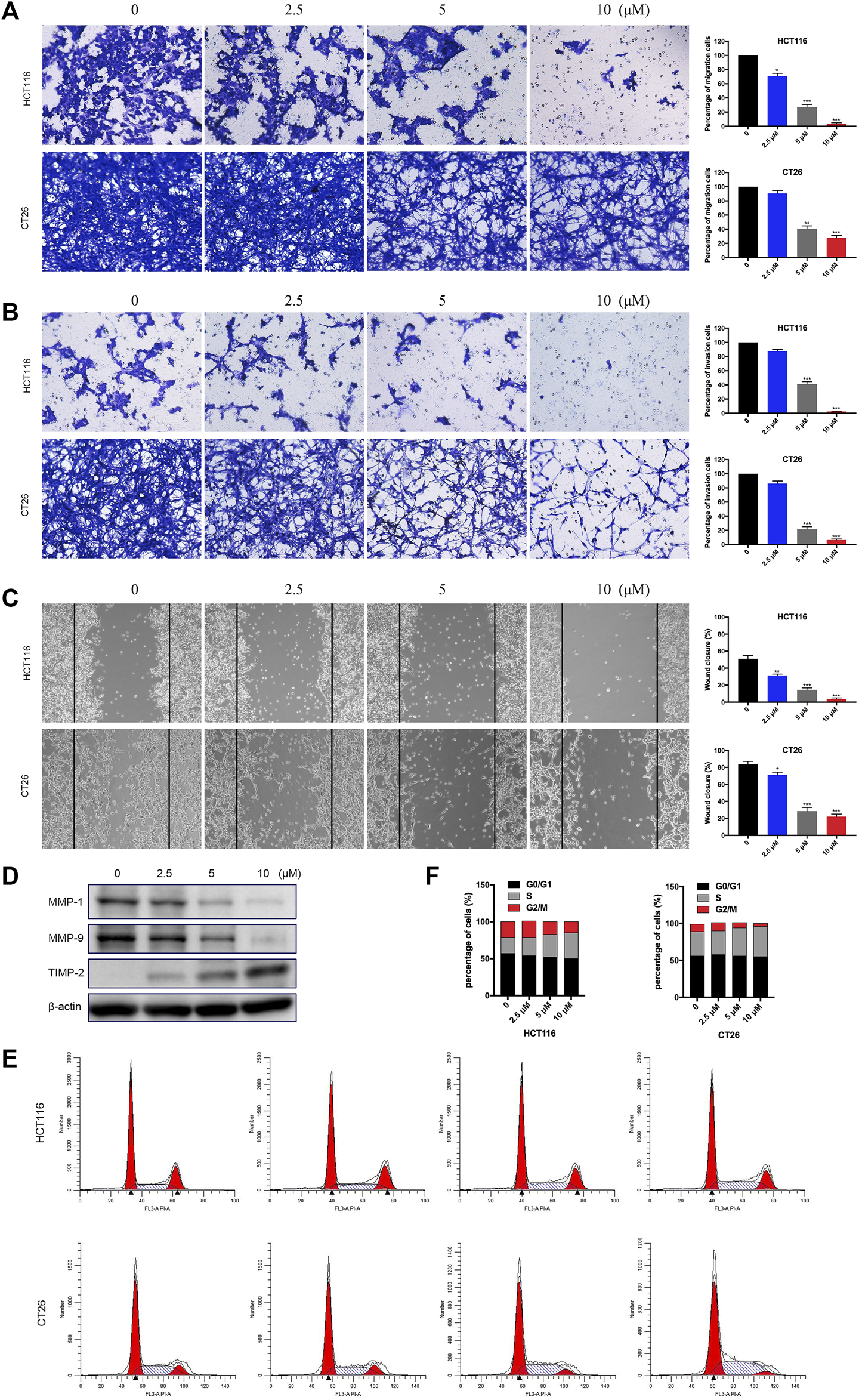 FIGURE 5. BTD inhibited the migration and invasion ability of cells. (A,B) Cells were treated with BTD (0, 2.5, 5, or 10 μM) for 24 h and subjected to migration (A) and invasion (B) assays, and then photographed (×100). (C) Cells were seeded, and a “wound” was created, then incubated with BTD (0, 2.5, 5, or 10 μM) for 24 h and photographed (×100). The lines indicate the area occupied by the initial scraping, and migrated cells were quantified. (D) The levels of MMP2, MMP9, and TIMP2 were detected using Western blotting. (E,F) Flow cytometry was used to analyze the cell cycle distribution. The values are shown as histograms.