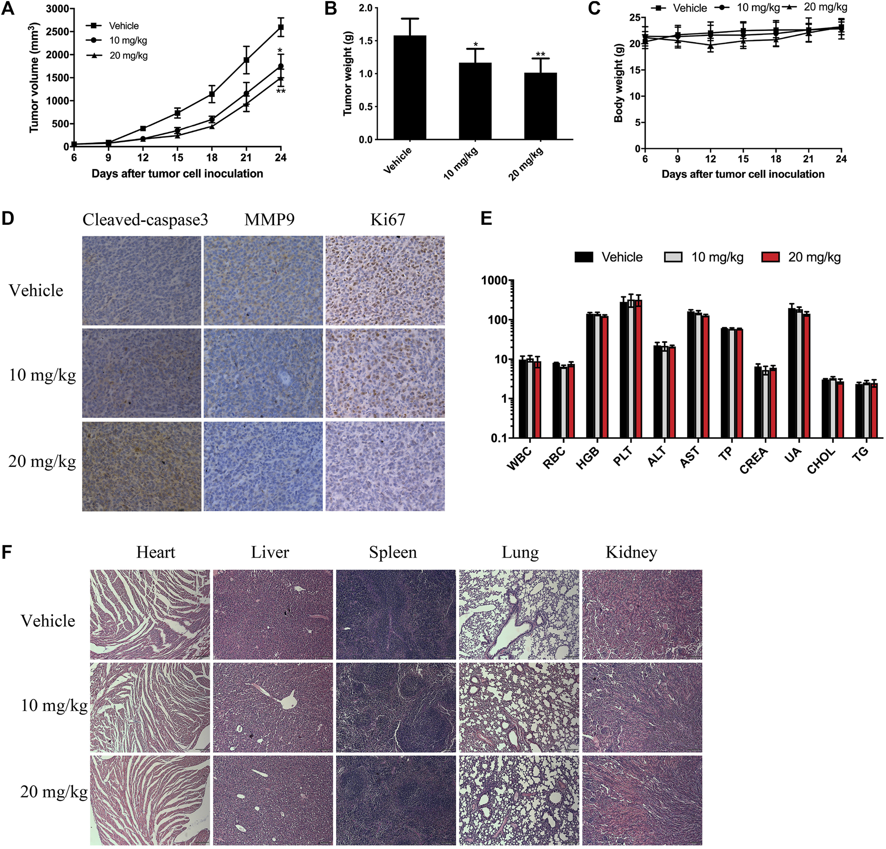 FIGURE 6. BTD suppressed tumor growth in vivo. CT26 tumor-bearing mice were treated with 10 mg/kg or 20 mg/kg of BTD, or vehicle. (A) Tumor volume curve of the mice. (B) The bars represent tumor weight. (C) Body weight curve of the mice. (D) IHC staining for cleaved caspase-3, MMP9, and Ki-67 in tumor tissues. (E) Serological and hematological analyses. The units of the parameters are as follows: white blood cell (WBC) red blood cell (RBC) (1012/L), hemoglobin (HGB) (g/L), platelet (PLT) (109/L), alanine aminotransferase (ALT), aspartate aminotransferase (AST) (U/L), total protein (TP) (g/L), creatinine (CREA), uric acid (UA) (μM), cholesterol (CHOL) (mM), and triglyceride (TG). (F) H&E staining of the heart, liver, spleen, lung, and kidney (×100).