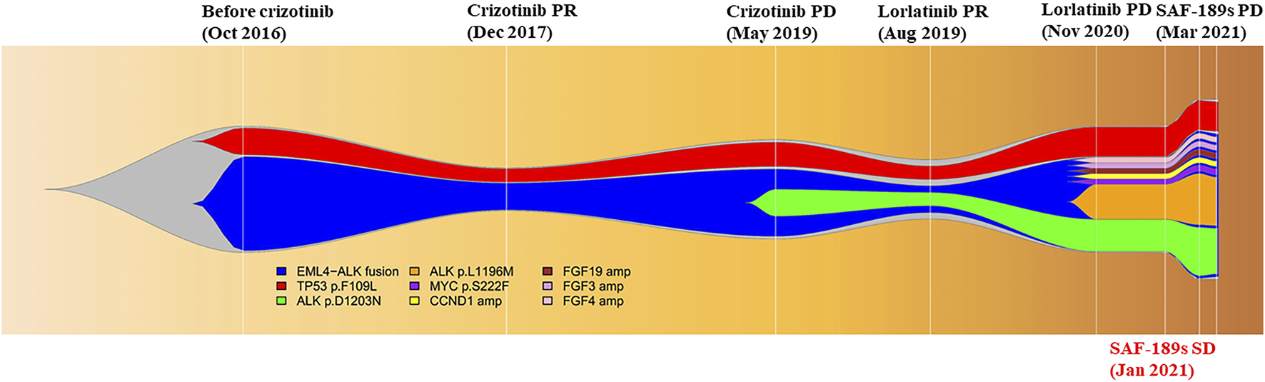 In conclusion, we report a metastatic ALK-rearranged NSCLC patient who was treated with sequential ALK TKIs and developed rare acquired ALK compound mutations (L1196M and D1203N) resulting in resistance to lorlatinib. Moreover, we are the first to describe the clinical responses of a patient with these ALK compound mutations to multiple therapies. Among them, SAF-189s and chemotherapy showed a clear antitumor effect, which may be viable therapeutic options. Thus, our study can provide some reference in the treatment of patients with ALK L1196M/D1203N compound mutations in the future.
