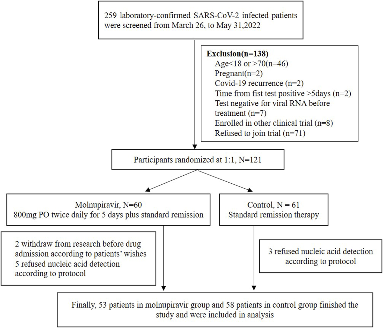 A total of 259 hospitalized laboratory-confirmed SARS-CoV-2-infected patients were screened. Among them, 121 patients were randomized: 60 were randomized to the molnupiravir group and 61 to the control group. Ten of these participants refused to undergo the viral nucleic acid test according to research protocol or asked to withdraw from the trial. Finally, 53 patients in the molnupiravir group and 58 patients in the control group completed the entire therapy and follow-up and were included in efficacy and safety analyses (Figure 1). All of these patients completed at least 3-time point VL test and 1-time point virus isolation and genome sequencing. We finally isolated 11 strains of the virus, and all of them belonged to the Omicron variant. The sequence was submitted to PubMed GenBank (ON965380; ON965371; ON965362; ON965361).