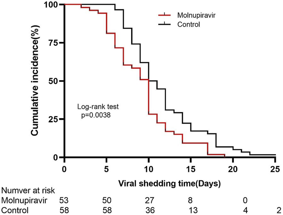 The primary endpoint of this study was the viral clearance time in nasopharyngeal swabs via the real-time RT-PCR test. Overall, compared with the patients in the control group, those in the molnupiravir group experienced faster viral clearance. The median time till viral clearance of SARS-CoV-2 in the molnupiravir group was significantly shorter than that in the control group (Table 2).