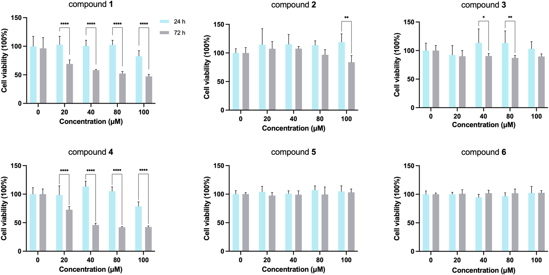 To evaluate the potential hepatotoxicity of six candidate compounds, MTT assay was performed on HepG2 cells, with the purpose of excluding compounds with greater hepatotoxicity and selecting appropriate intervention concentrations for subsequent activity verification experiments. After exposure to various concentrations of 0, 20, 40, 80 and 100 µM for 24 h and 72 h, cell viability was measured. As indicated in Figure 3, there was no significant change in cell status after 24 h intervention with six candidate compounds. Only compounds one and four showed significant hepatotoxicity after 72 h exposure, with the survival rate of HepG2 cells decreasing compared to the control group (p < 0.05), and the decrease of cell viability was positively correlated with the concentration. We observed that compound 2 with 20, 40, and 80 μM interventions for 72 h could all result in a slight decrease in cell viability. Non-etheless, this decrease was not significantly different from the effects observed after 24 h of treatment. When reaching 100 µM after 72 h intervention, compound 2 could cause significant hepatic cell death. These findings indicated that prolonged and high-dose interventions may lead to hepatotoxicity. Therefore, a 24 h intervention time was used for subsequent experiments.